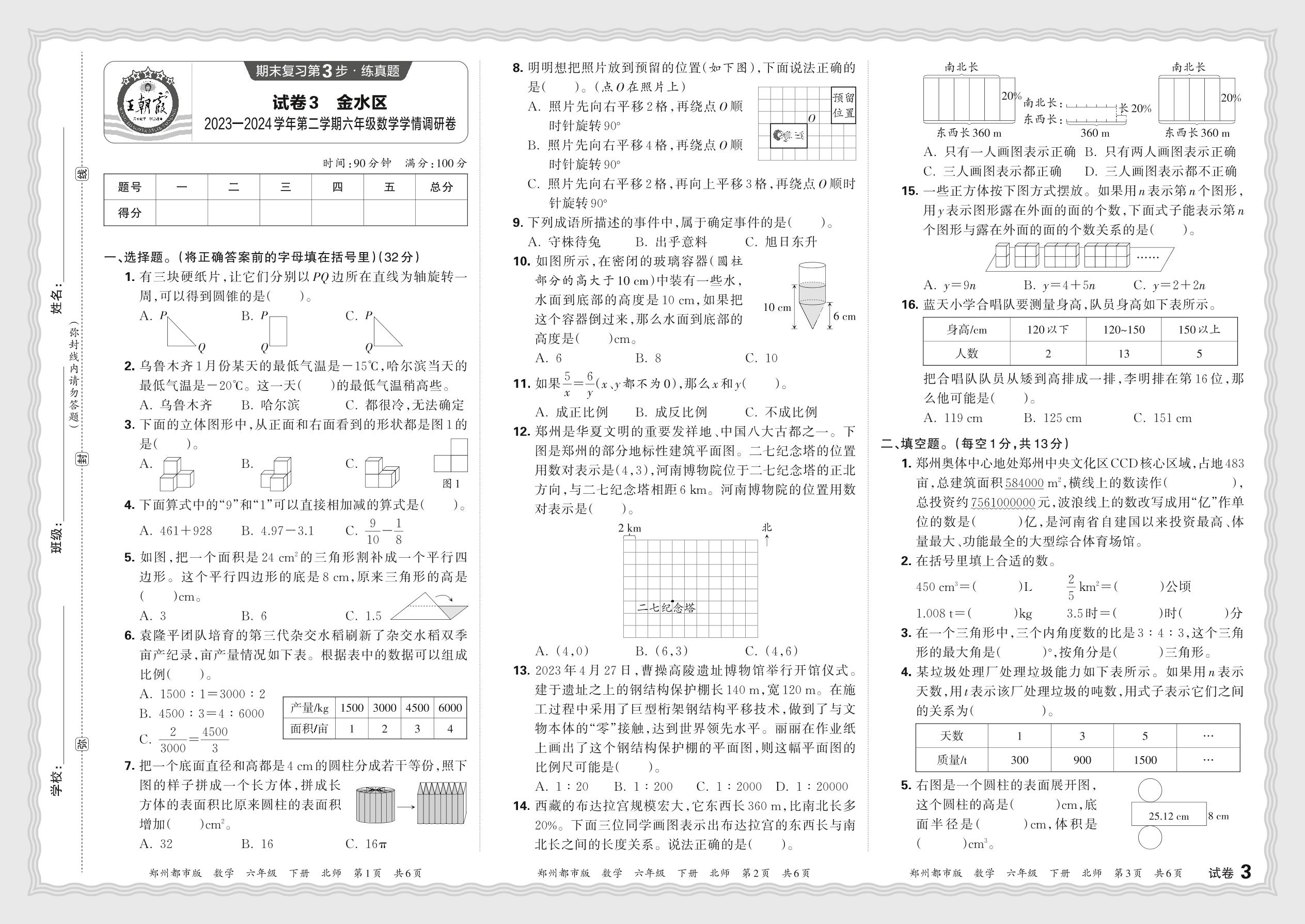 河南省郑州市金水区2023—2024学年第二学期六年级数学学情调研卷【3】