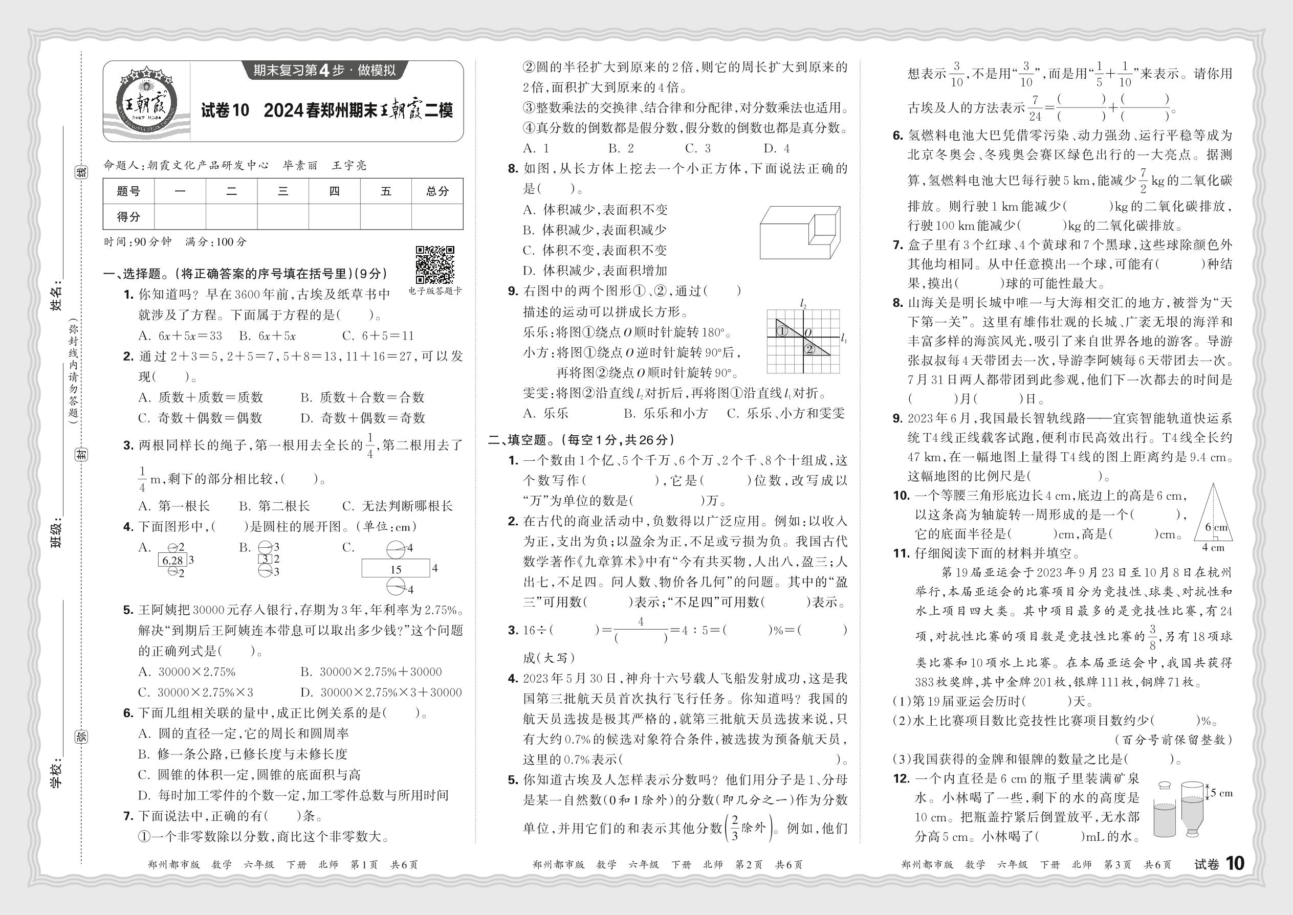 2024春下册六年级数学北师版 河南郑州期末王朝霞二模