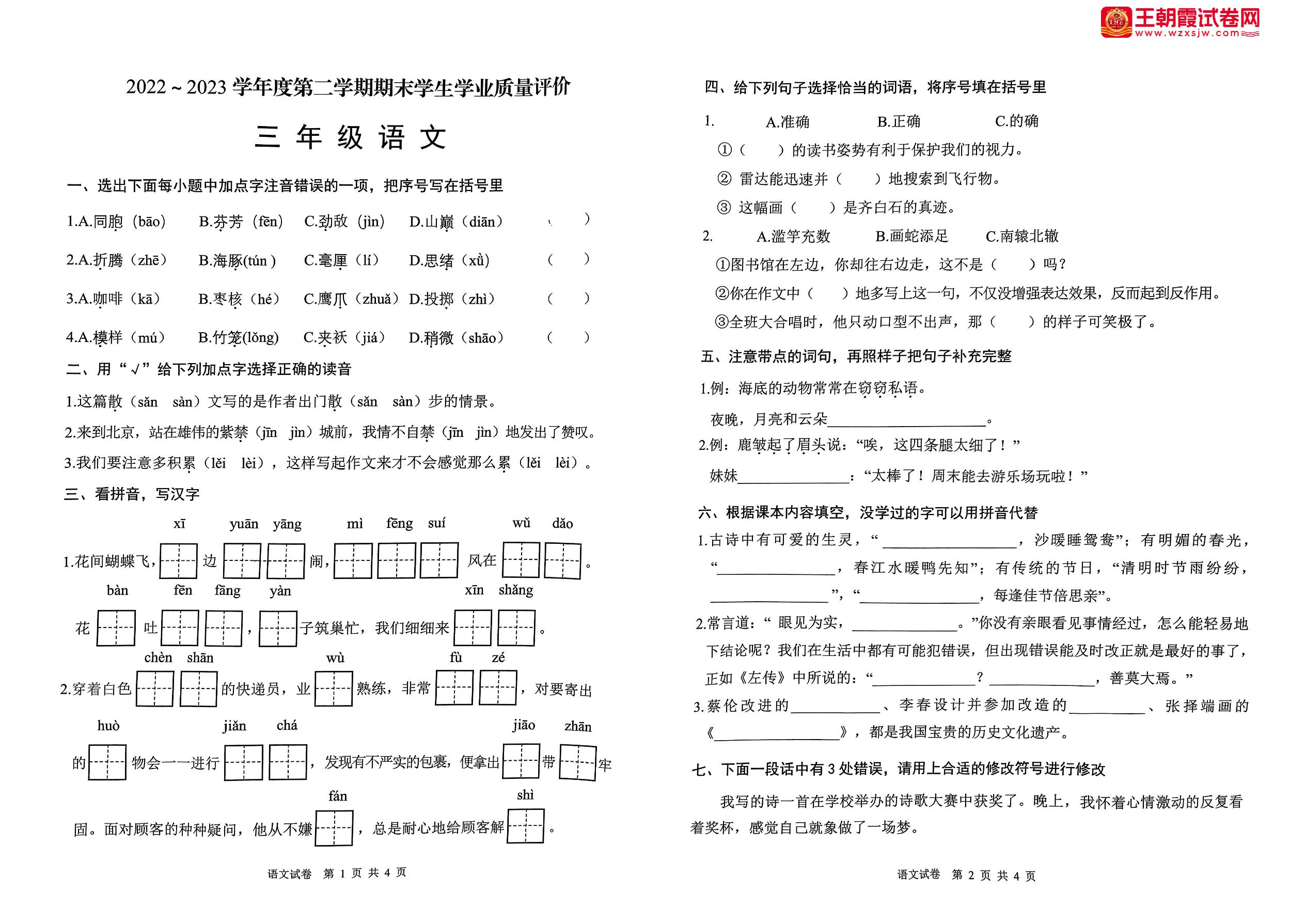 河北省石家庄市栾城区2022-2023学年第二学期期末学生学业质量评价三年级语文(人教版)