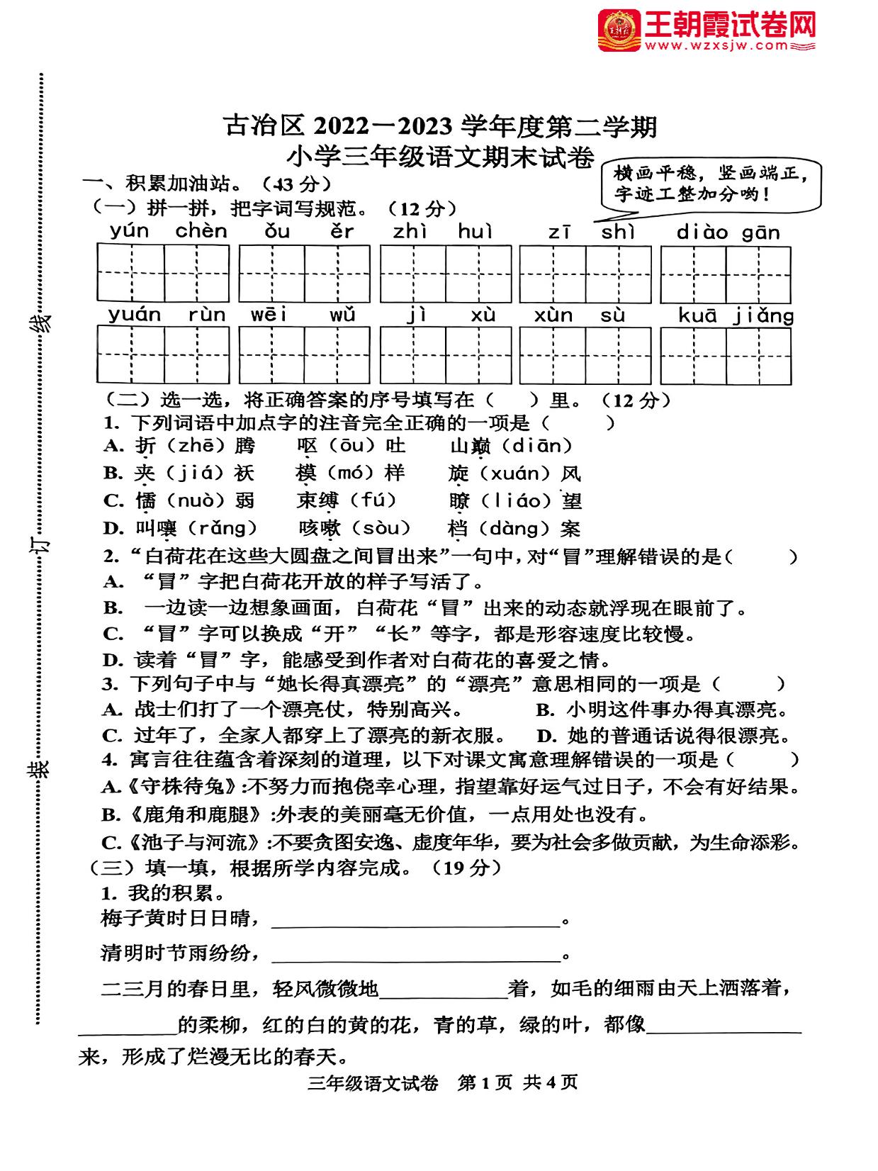 河北省唐山市古冶区2022-2023学年度第二学期期末试卷三年级语文(人教版)