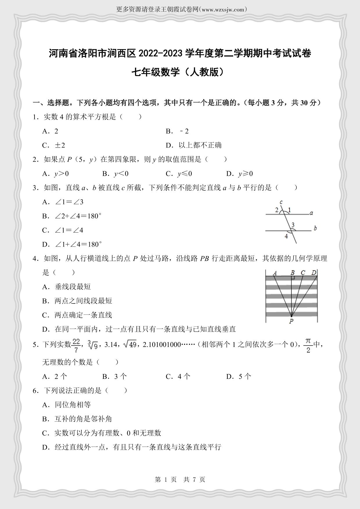河南省洛阳市涧西区2022-2023学年度第二学期期中考试试卷七年级数学(人教版)