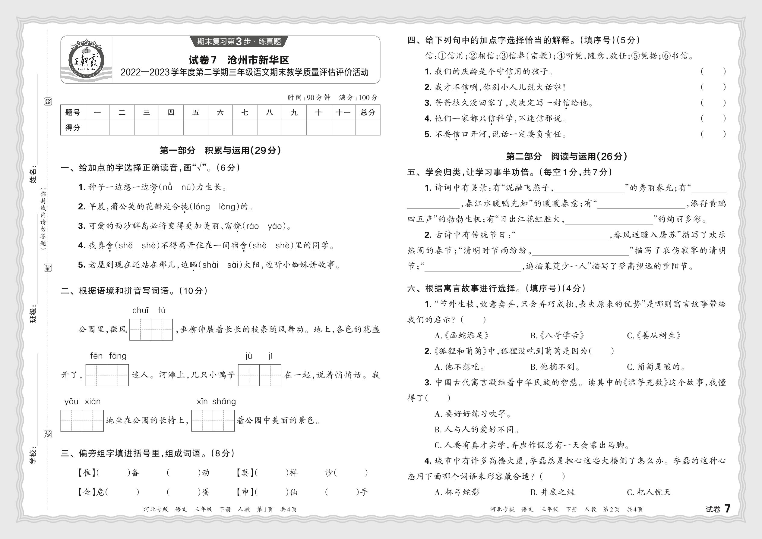 河北省沧州市新华区2022—2023学年度第二学期三年级语文期末教学质量评估评价活动(人教版)【7】