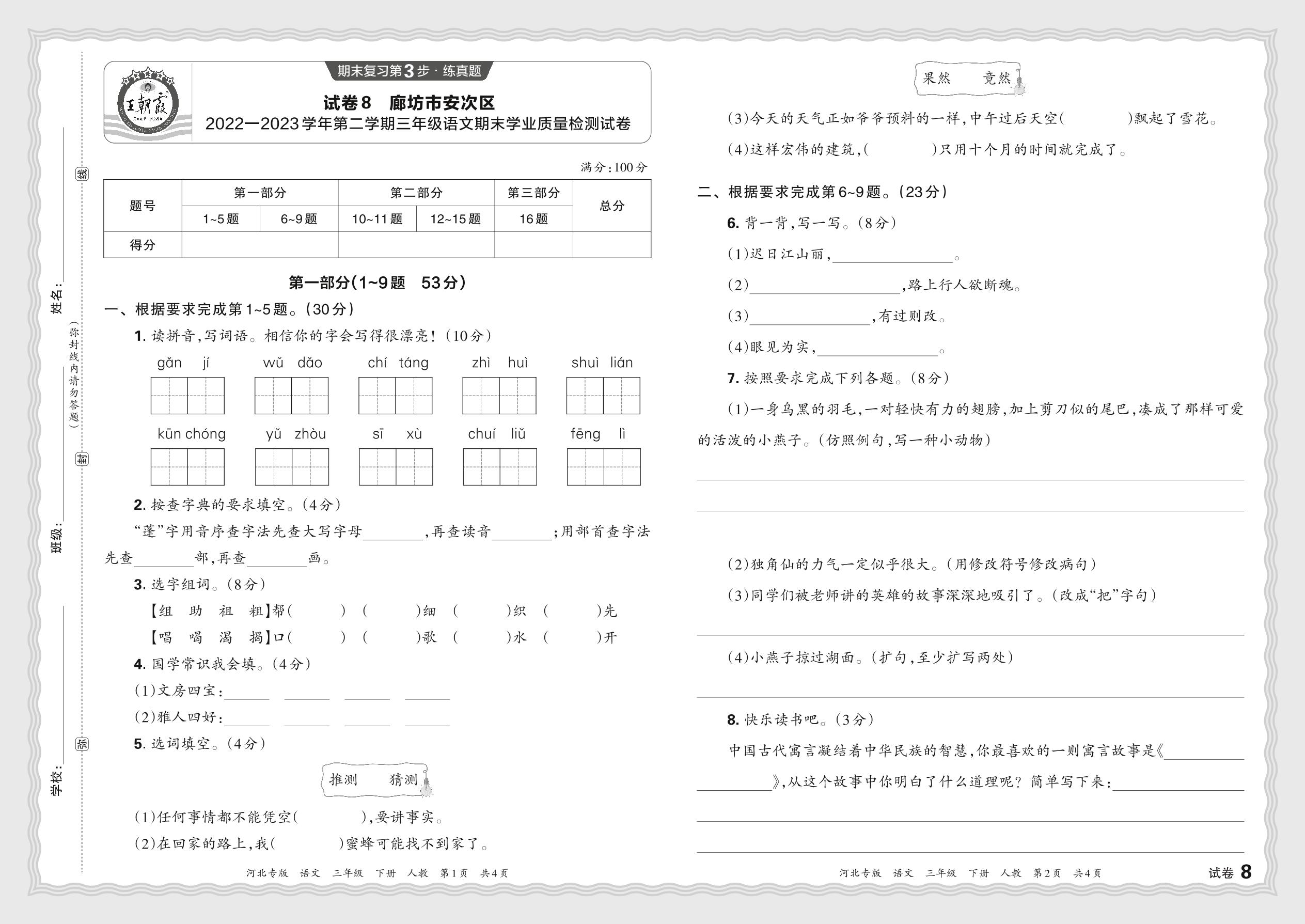 河北省廊坊市安次区2022—2023学年第二学期三年级语文期末学业质量检测试卷(人教版)【8】