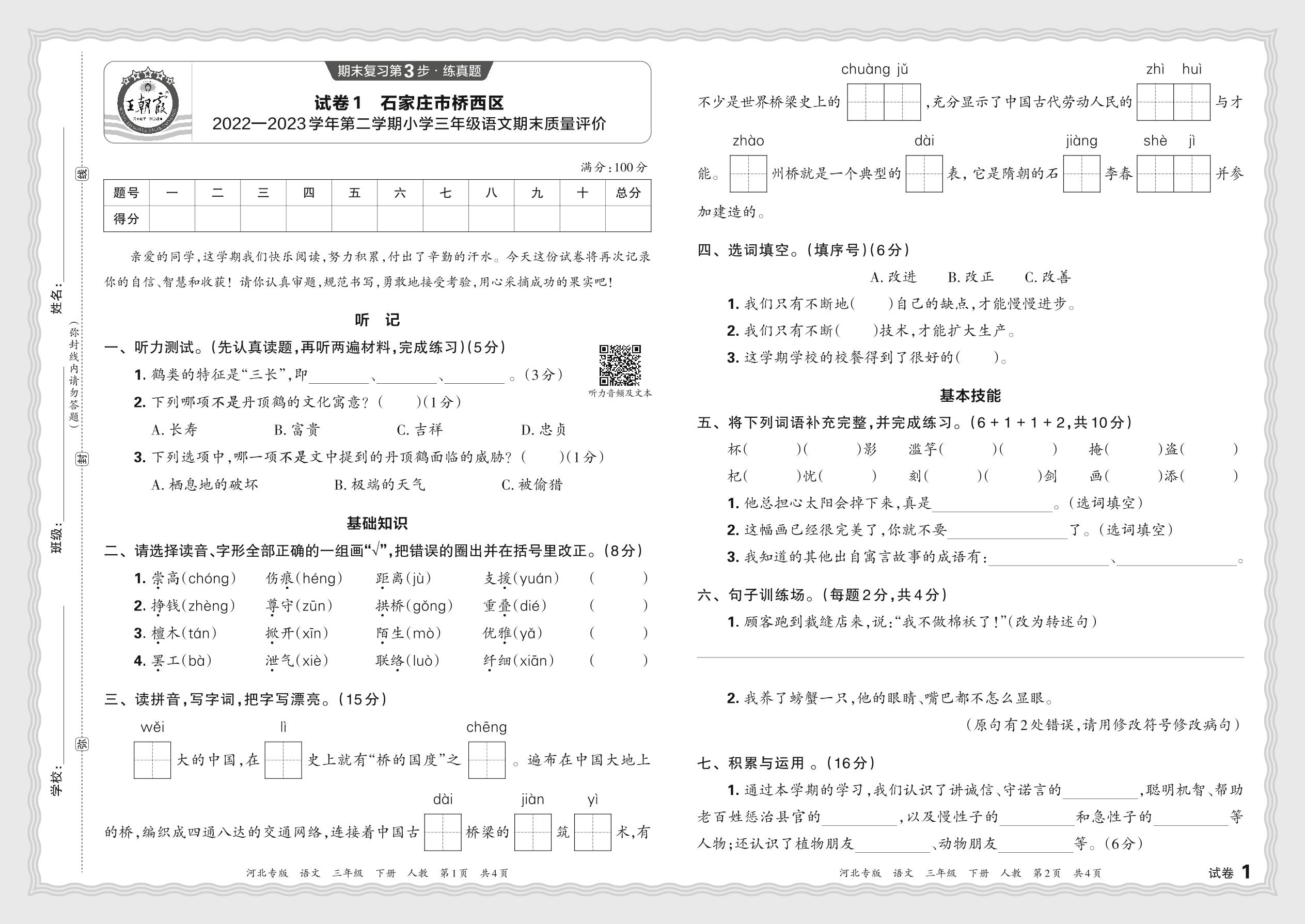 河北省石家庄市桥西区2022—2023学年第二学期小学三年级语文期末质量评价(人教版)【1】