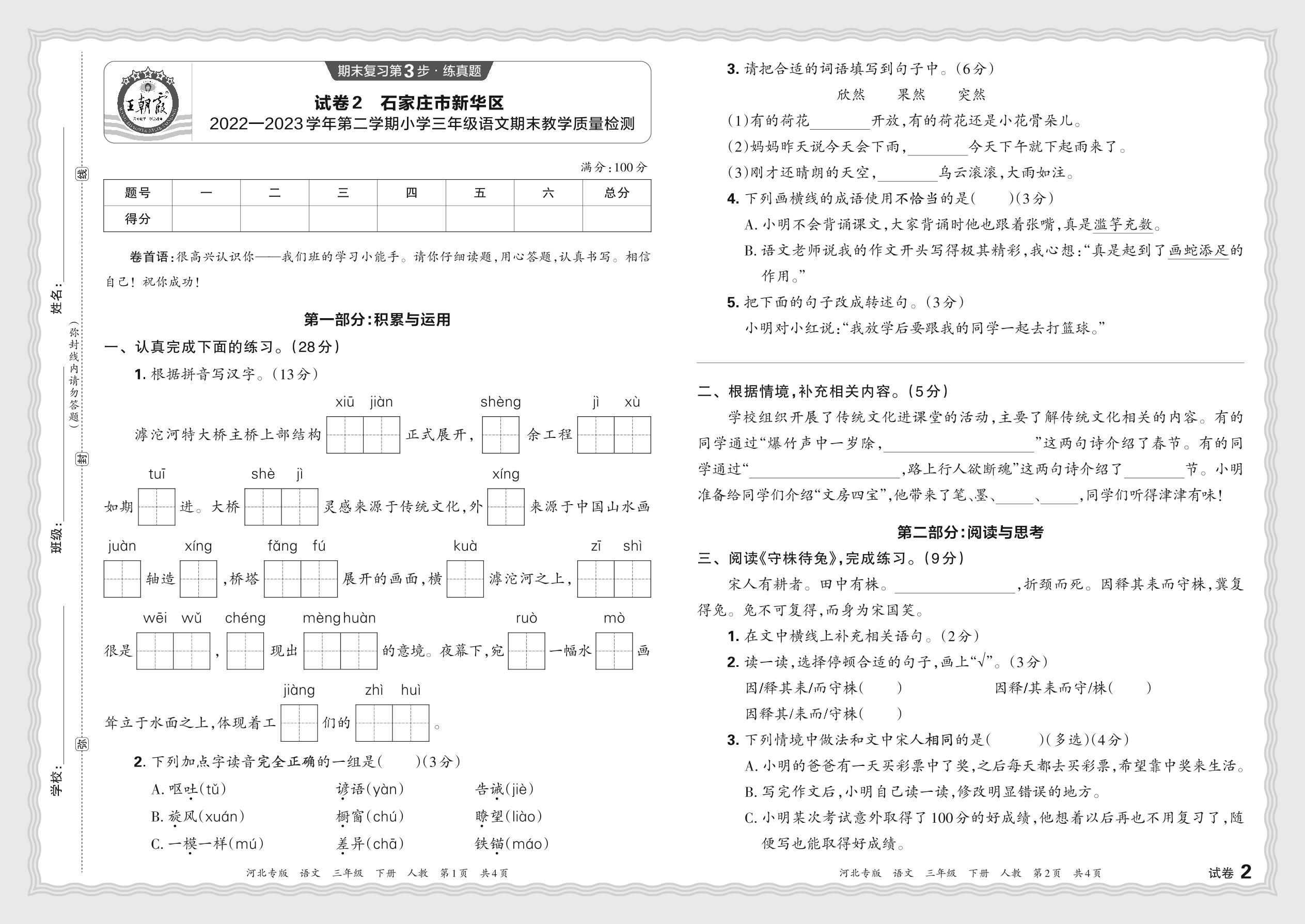 河北省石家庄市新华区2022—2023学年第二学期小学三年级语文期末教学质量检测(人教版)【2】
