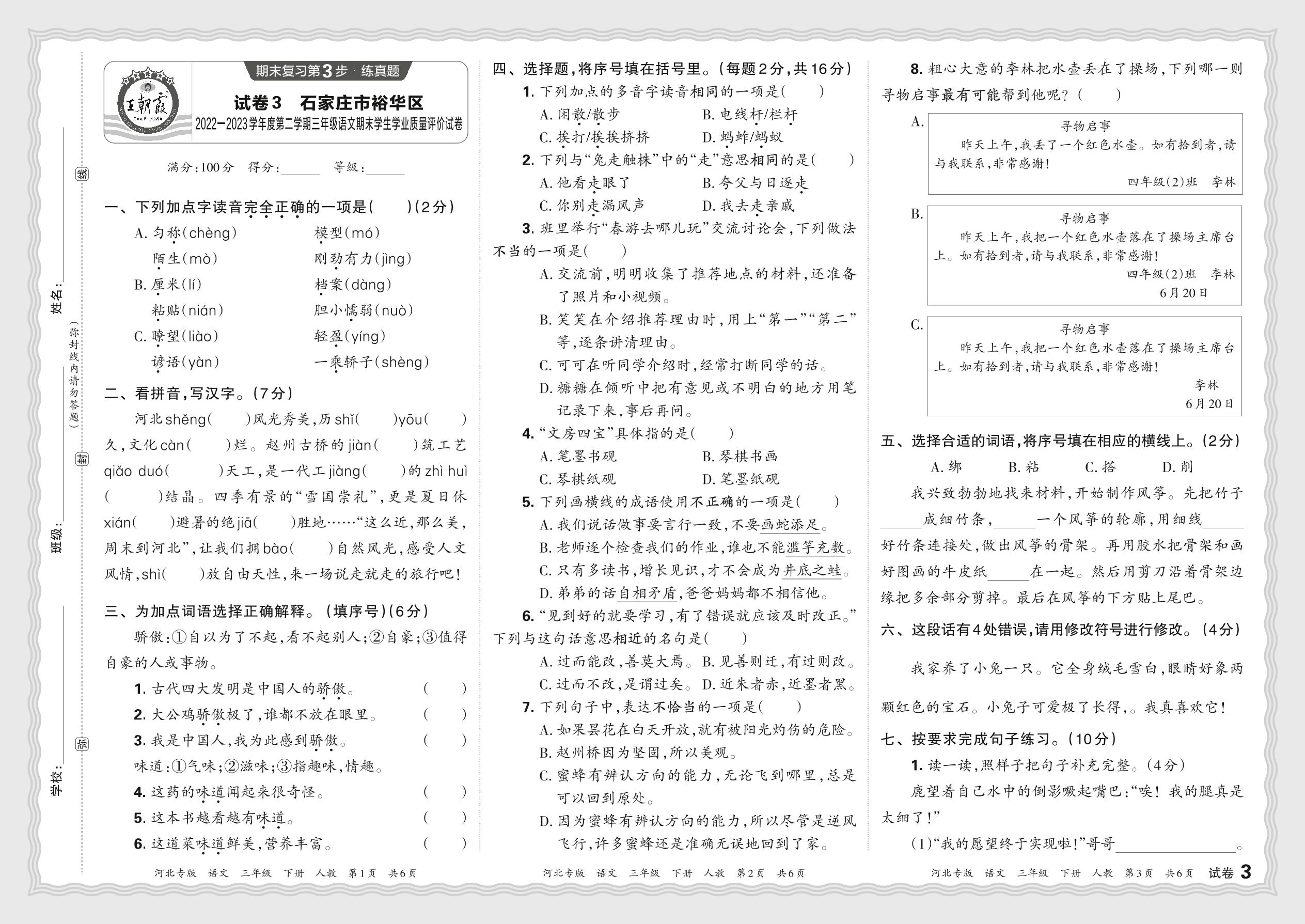 河北省石家庄市裕华区2022—2023学年度第二学期三年级语文期末学生学业质量评价试卷(人教版)【3】