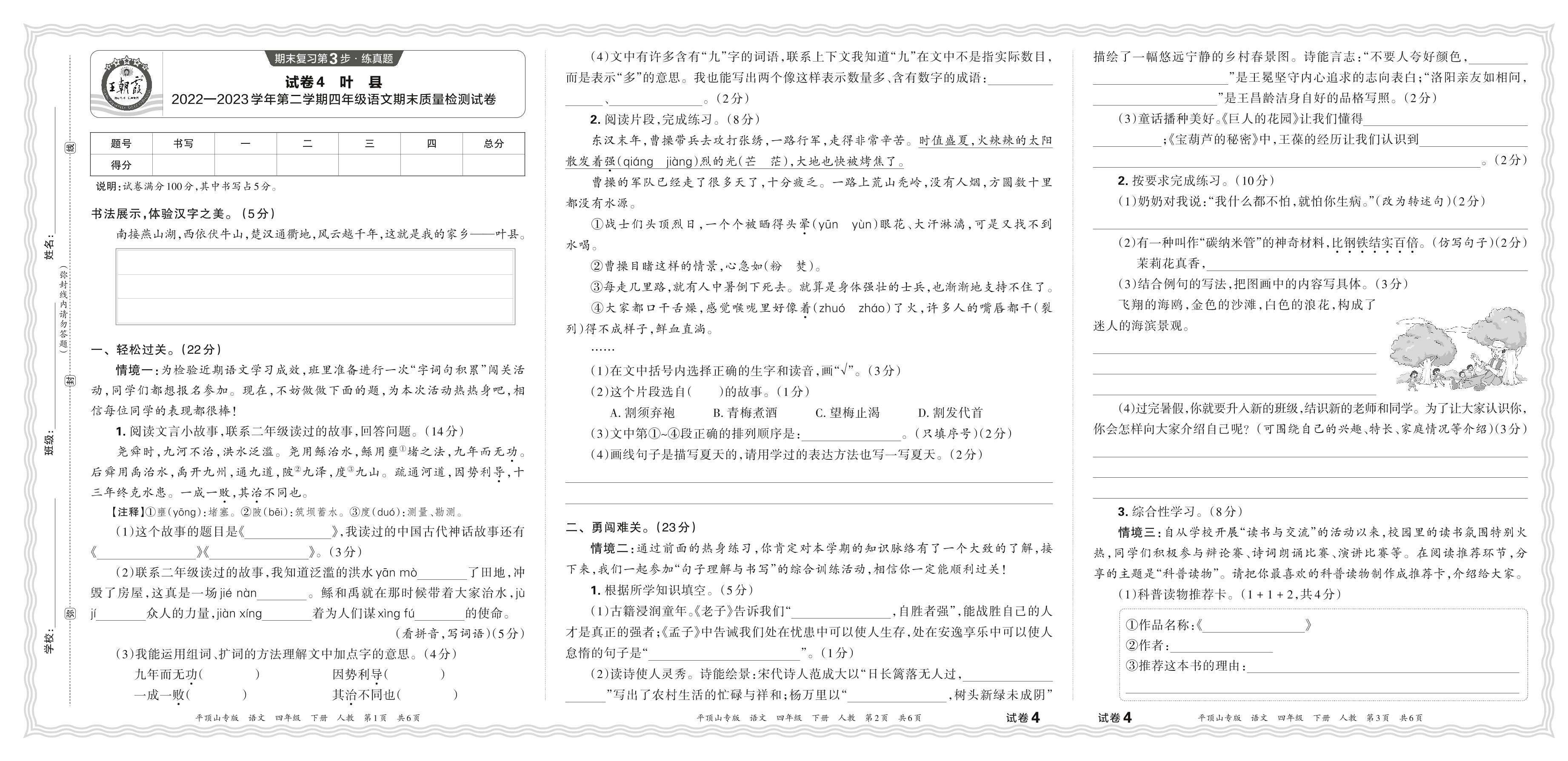 河南省平顶山市叶县2022-2023学年第二学期四年级语文期末质量检测试卷(人教版)【4】
