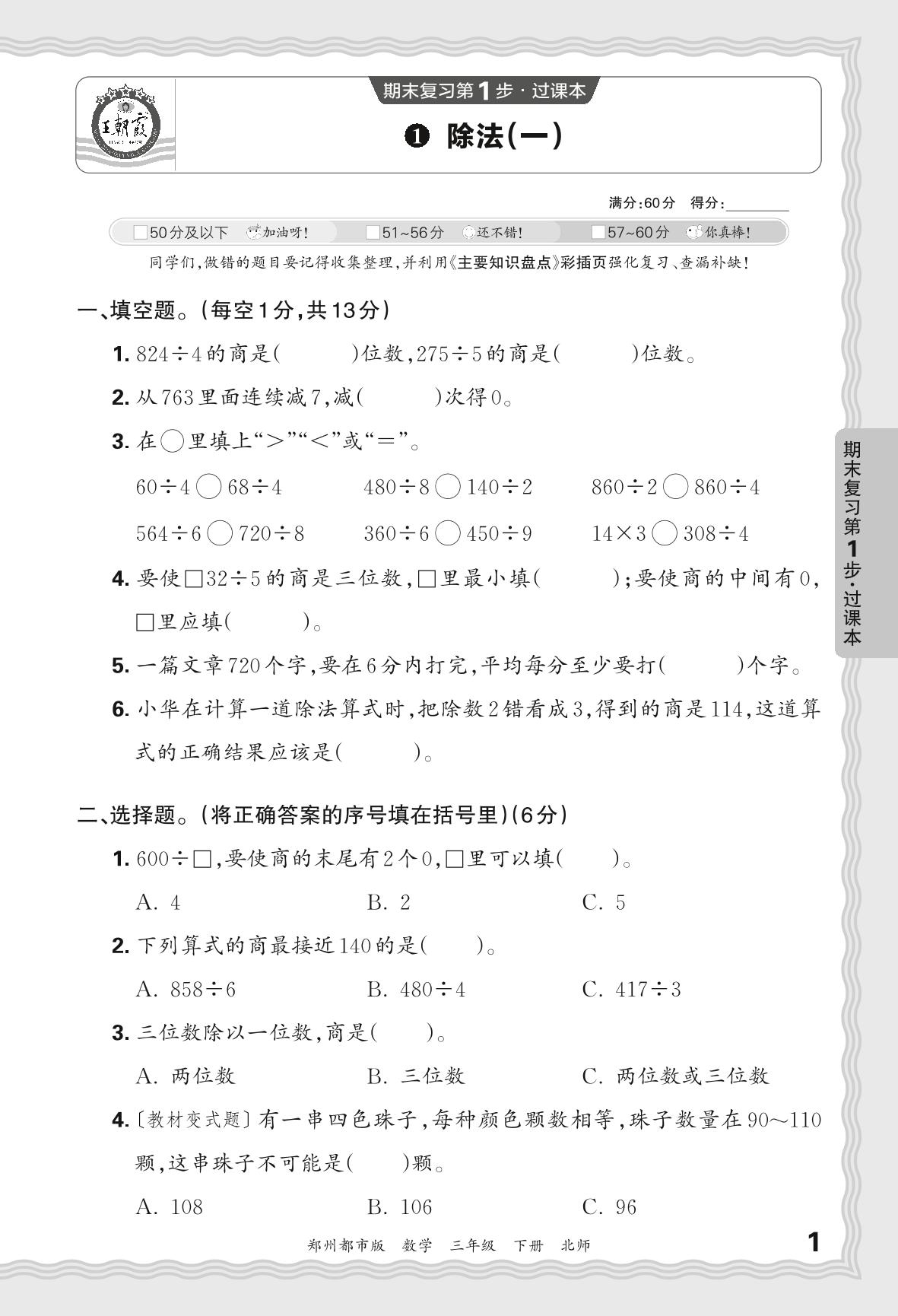 2024春下册三年级数学北师版 期末过课本郑州版·除法(一)【1】
