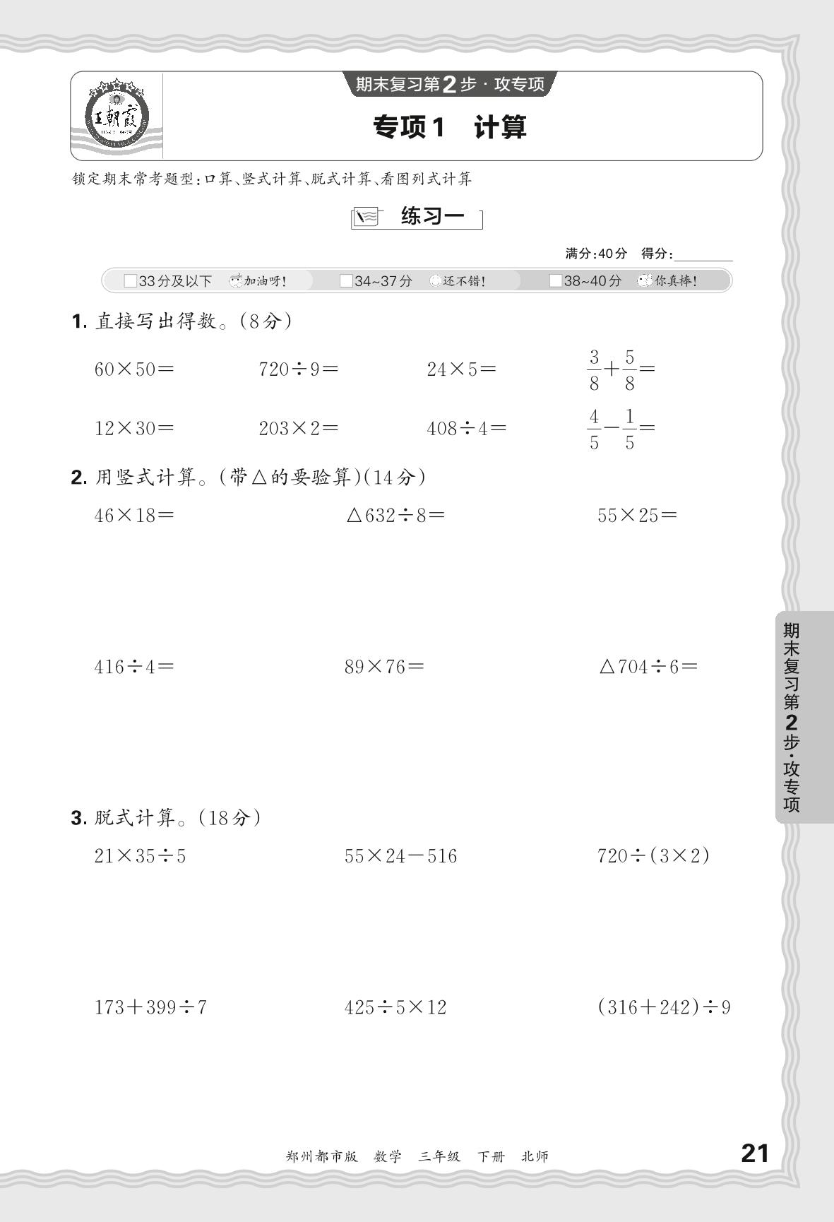 2024春下册三年级数学北师版 期末专项卷郑州版·计算【1】