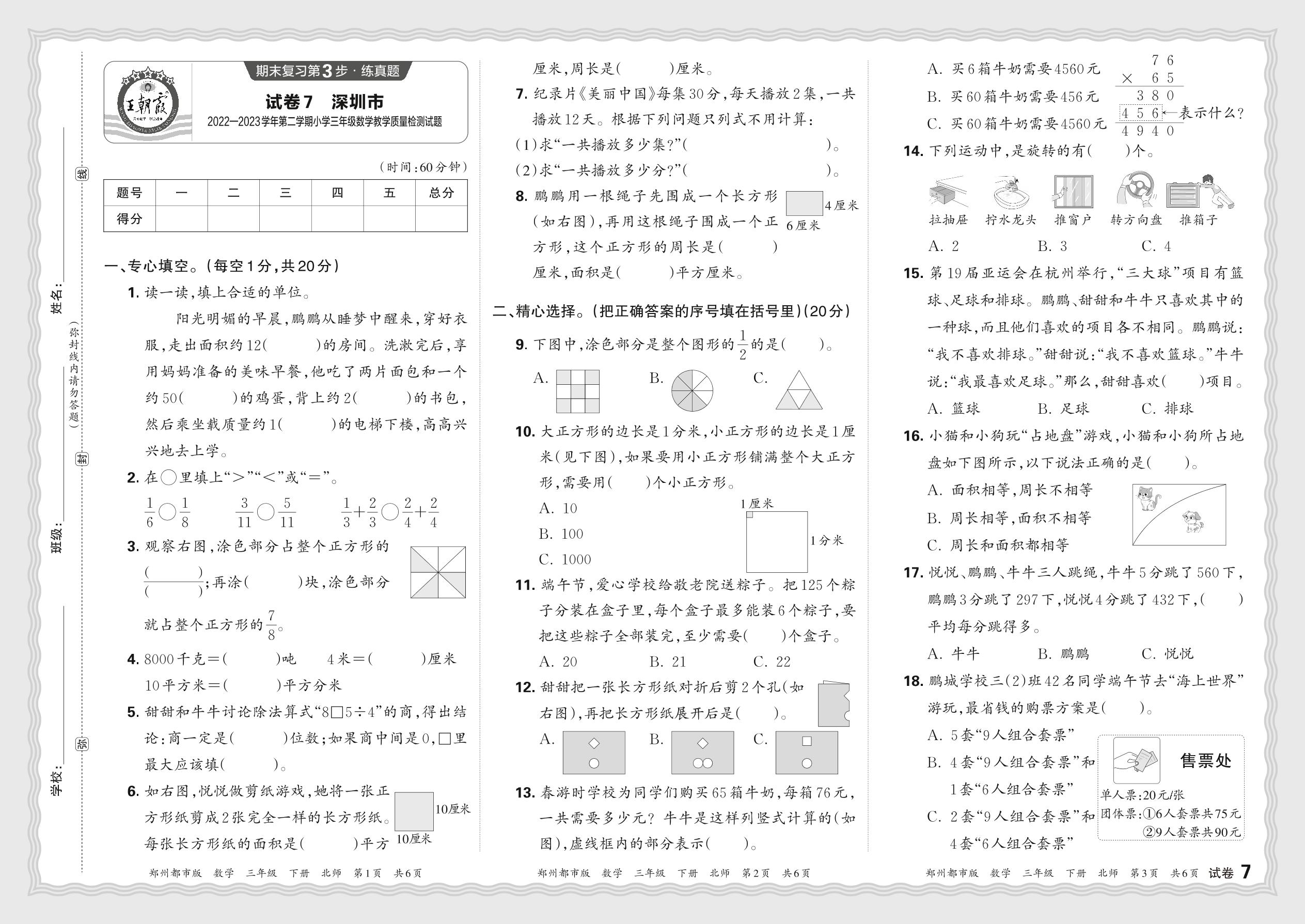 深圳市2022—2023学年第二学期小学三年级数学期末教学质量检测试题(北师版)【7】