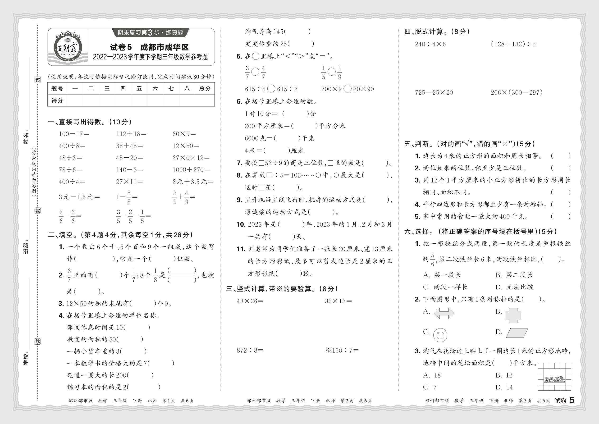 四川省成都市成华区2022—2023学年度下学期三年级数学参考题(北师版)【5】