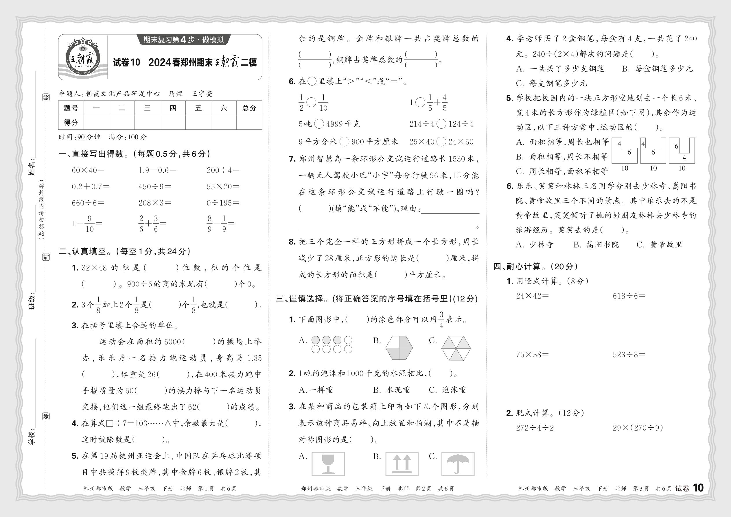 2024春下册三年级数学北师版 河南郑州期末王朝霞二模