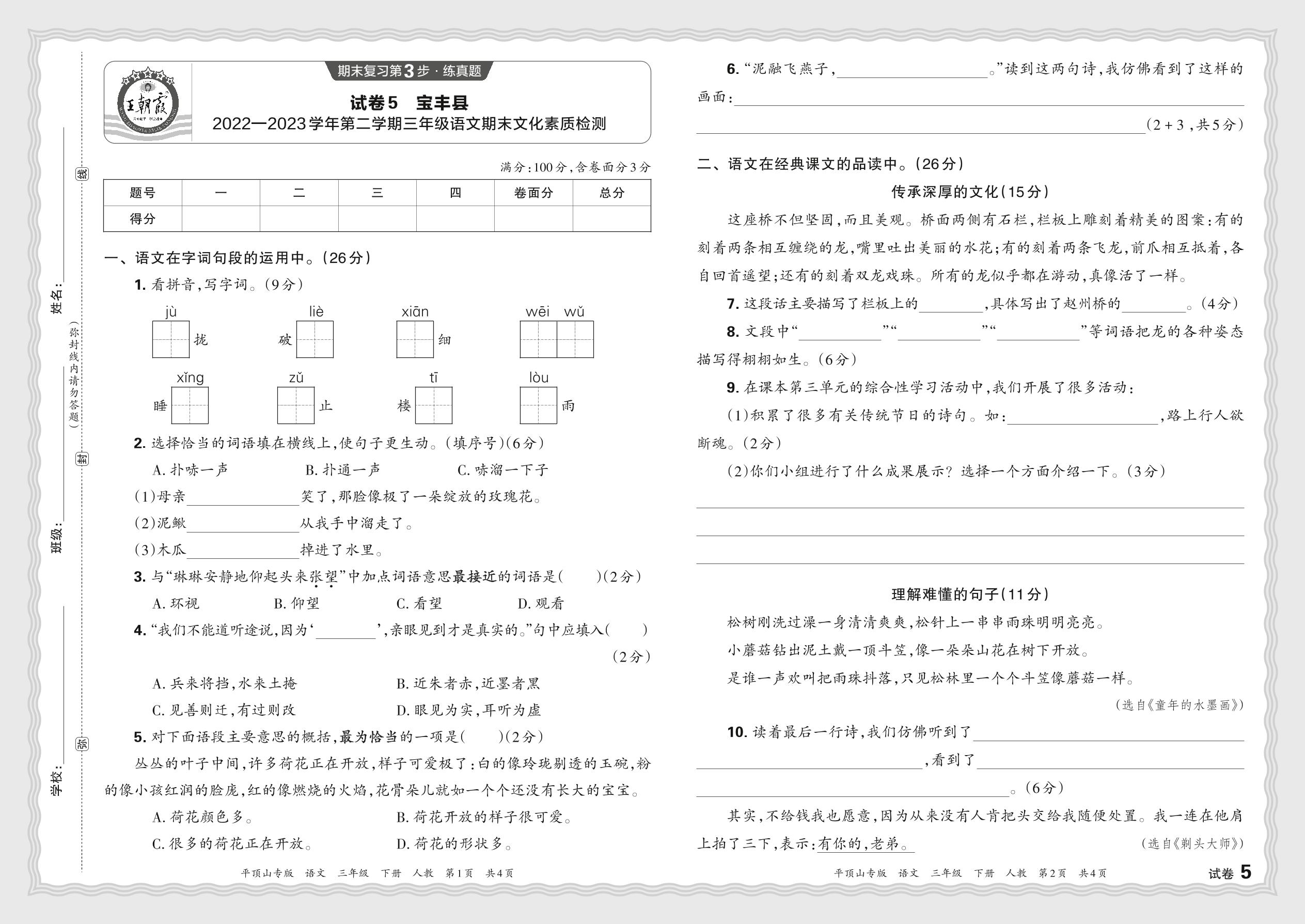 河南省平顶山市宝丰县2022-2023学年第二学期三年级语文期末文化素质检测(人教版)【5】