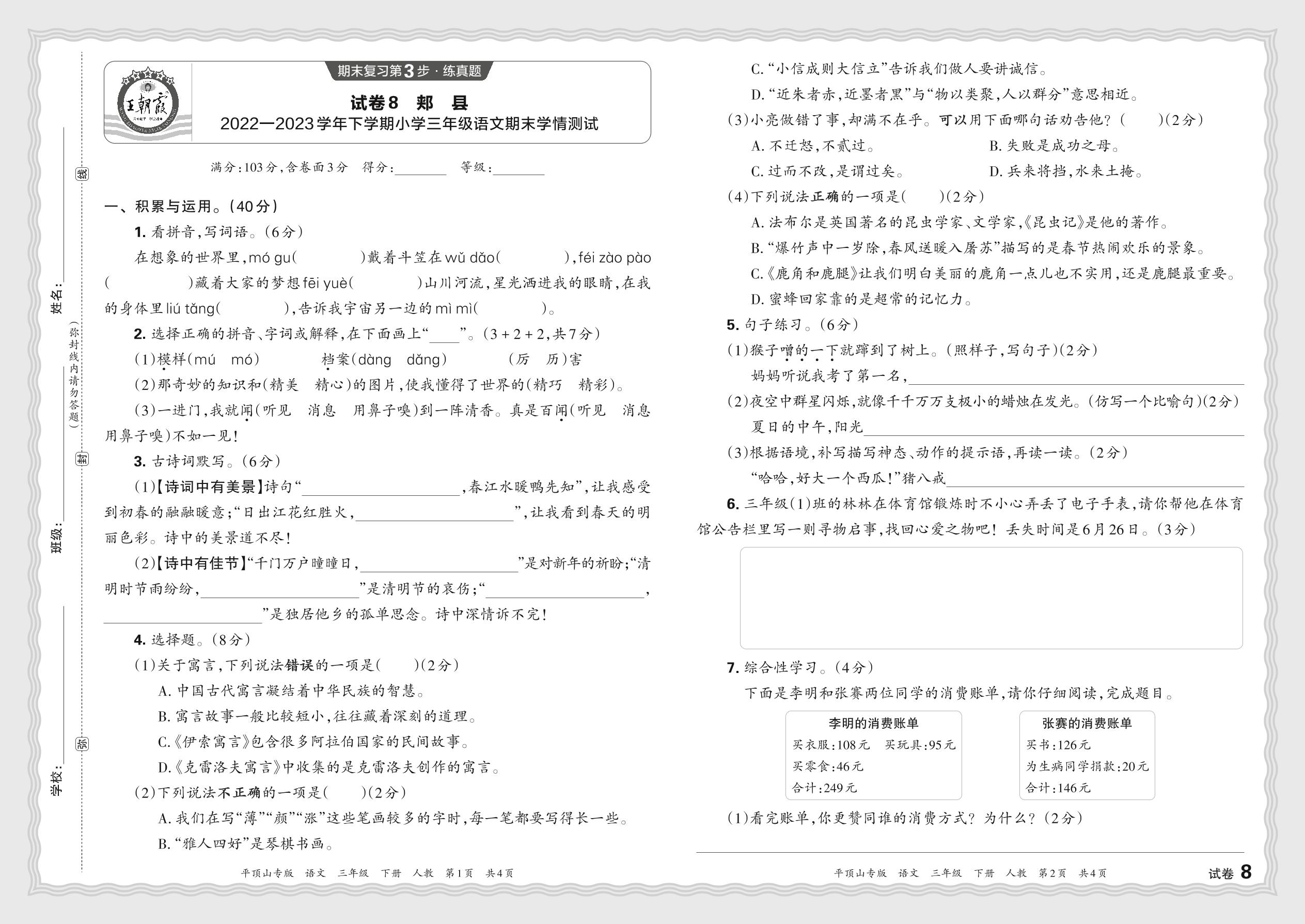 三年级语文人教版下册期末卷
