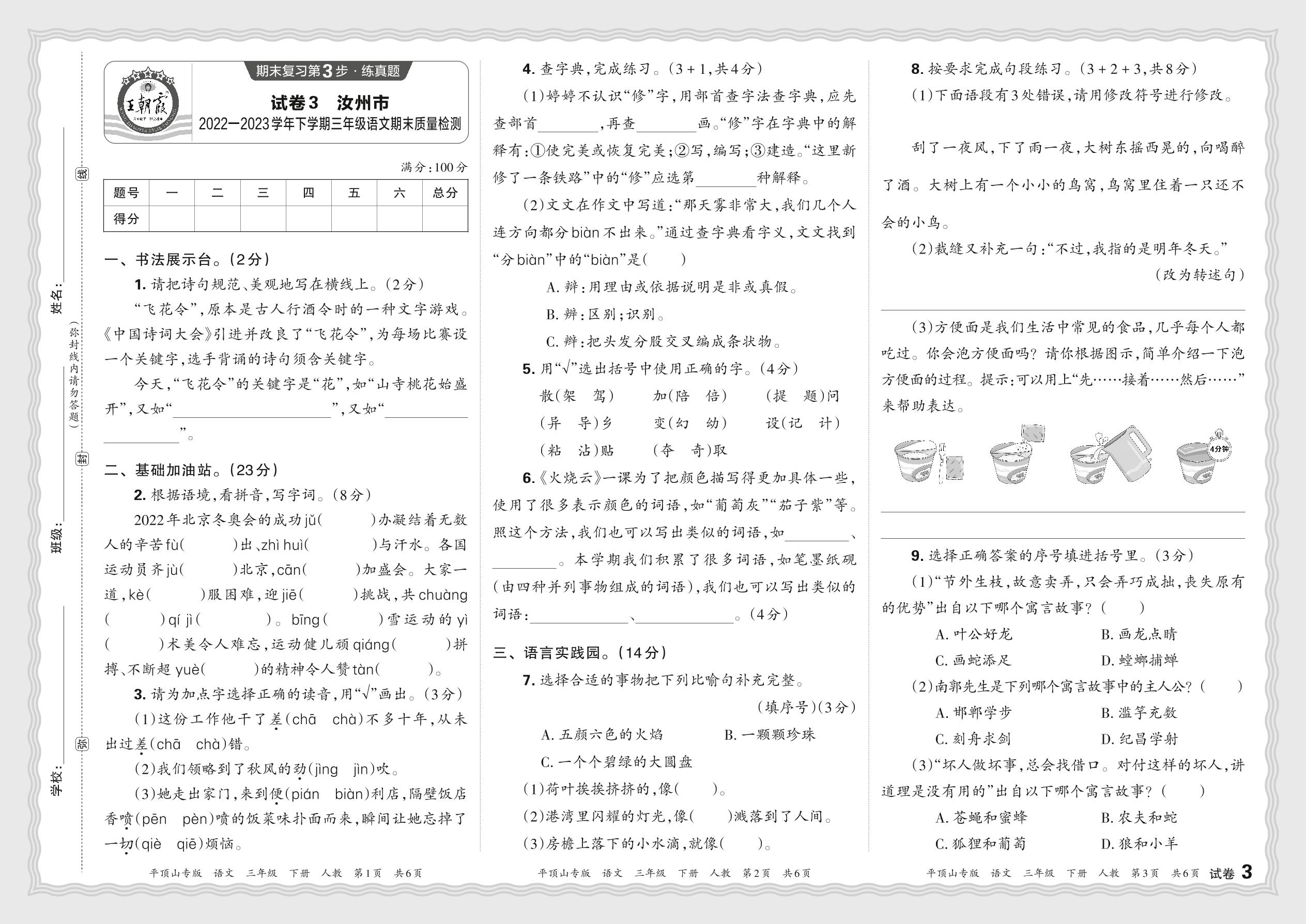 河南省平顶山市汝州市2022-2023学年下学期三年级语文期末质量检测(人教版)【3】