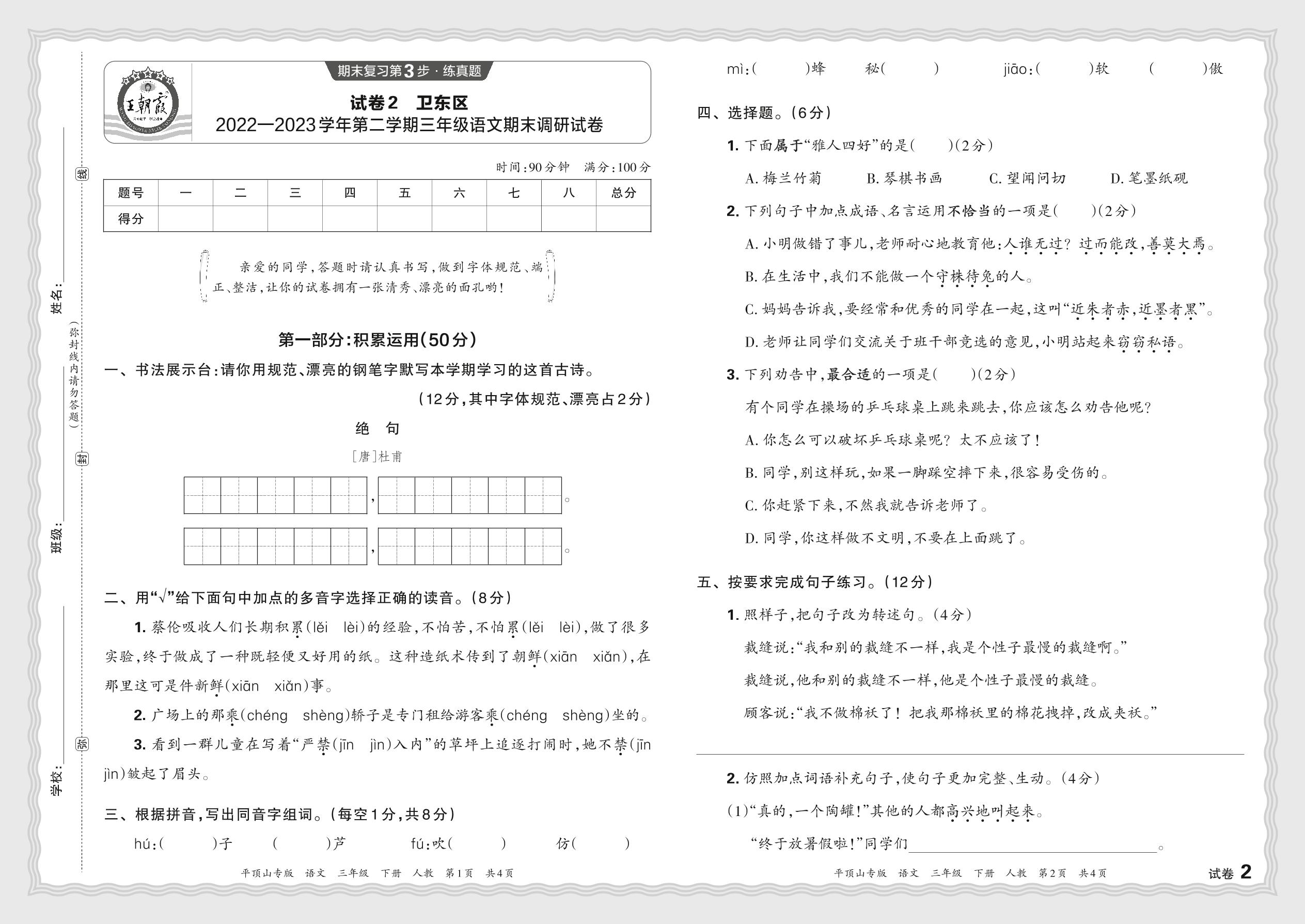 河南省平顶山市卫东区2022-2023学年第二学期三年级语文期末调研试卷(人教版)【2】