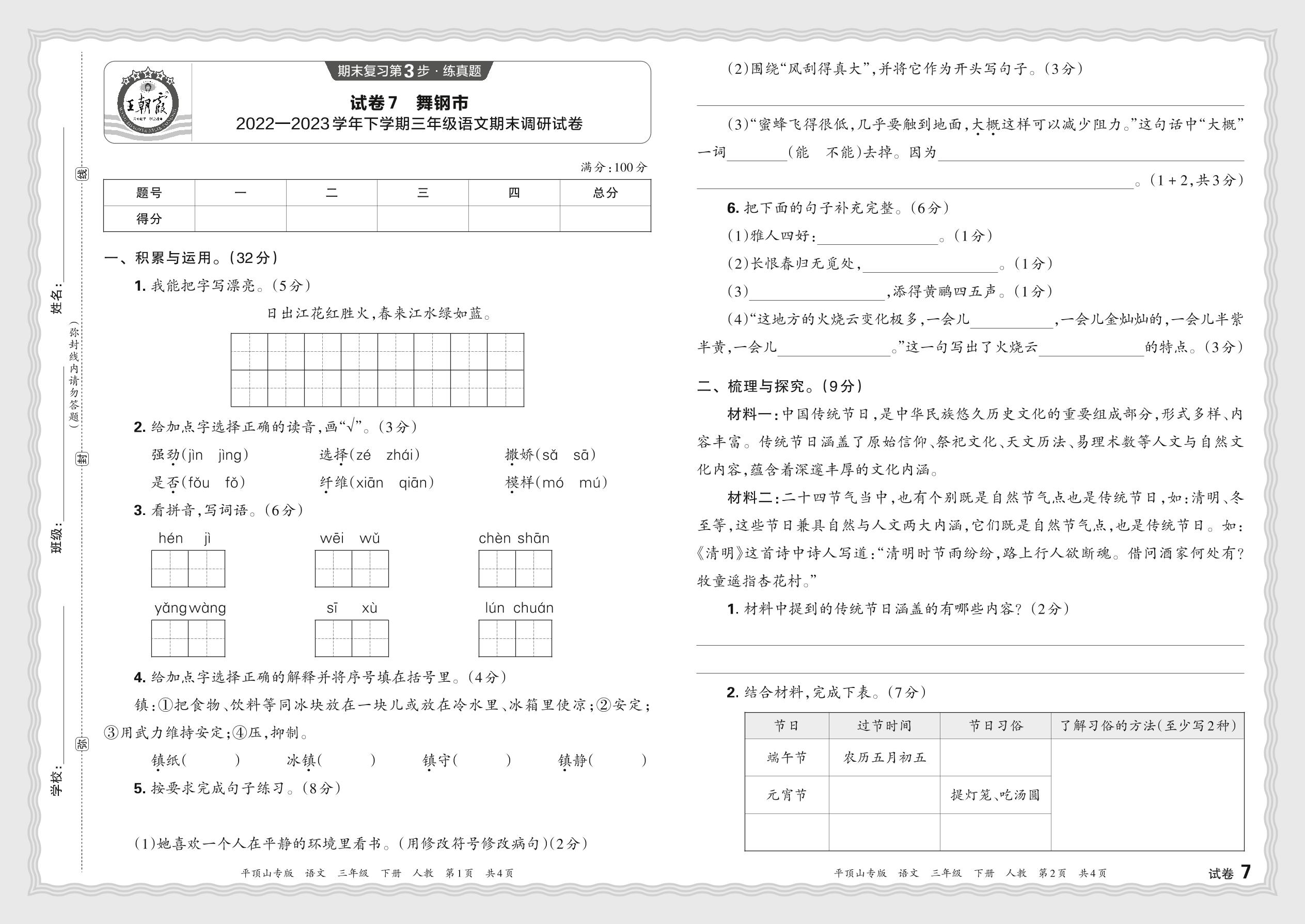河南省平顶山市舞钢市2022-2023学年下学期三年级语文期末调研试卷(人教版)【7】