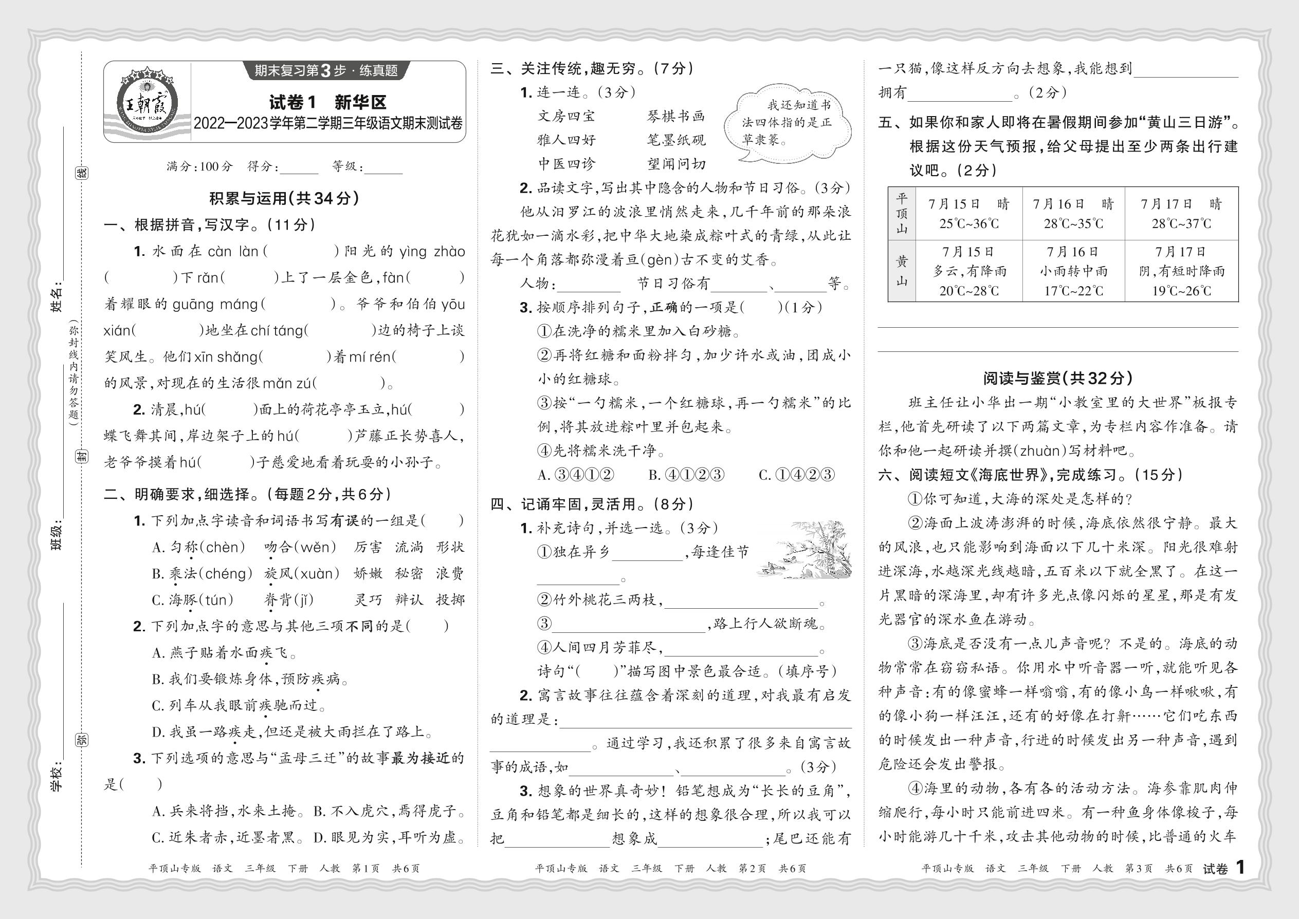 河南省平顶山市新华区2022-2023学年第二学期三年级语文期末测试卷(人教版)【1】