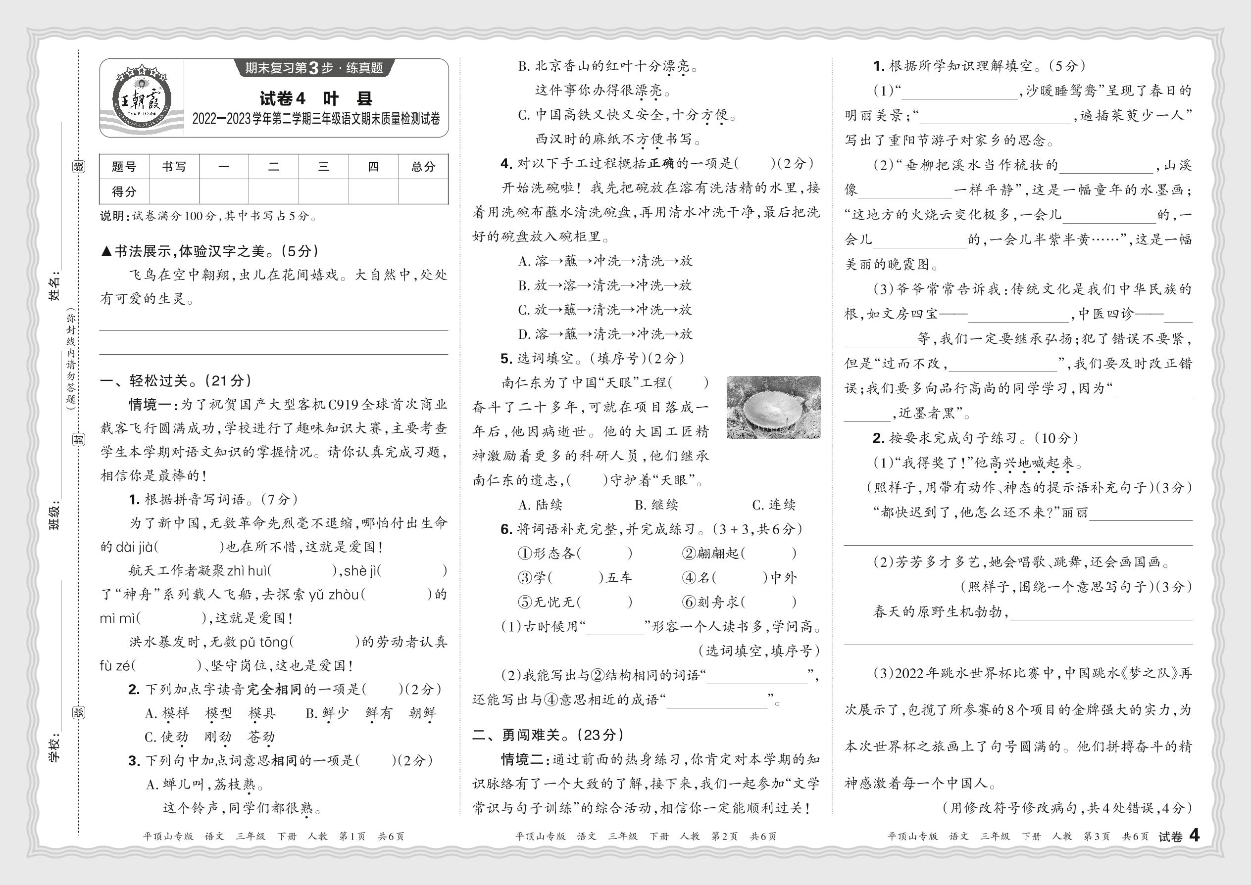 河南省平顶山市叶县2022-2023学年第二学期三年级语文期末质量检测试卷(人教版)【4】