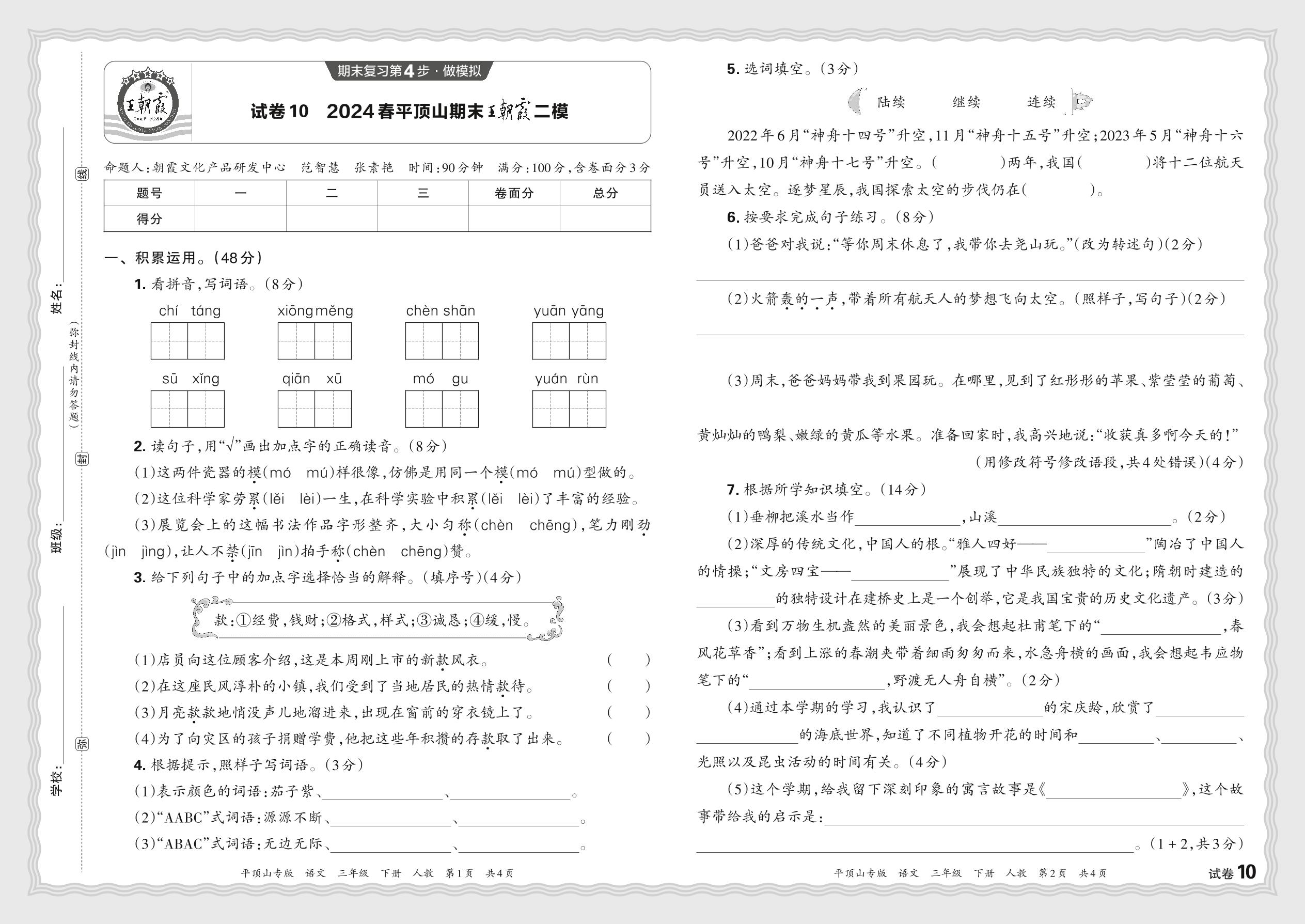 2024春下册三年级语文人教版 河南平顶山期末王朝霞二模【10】
