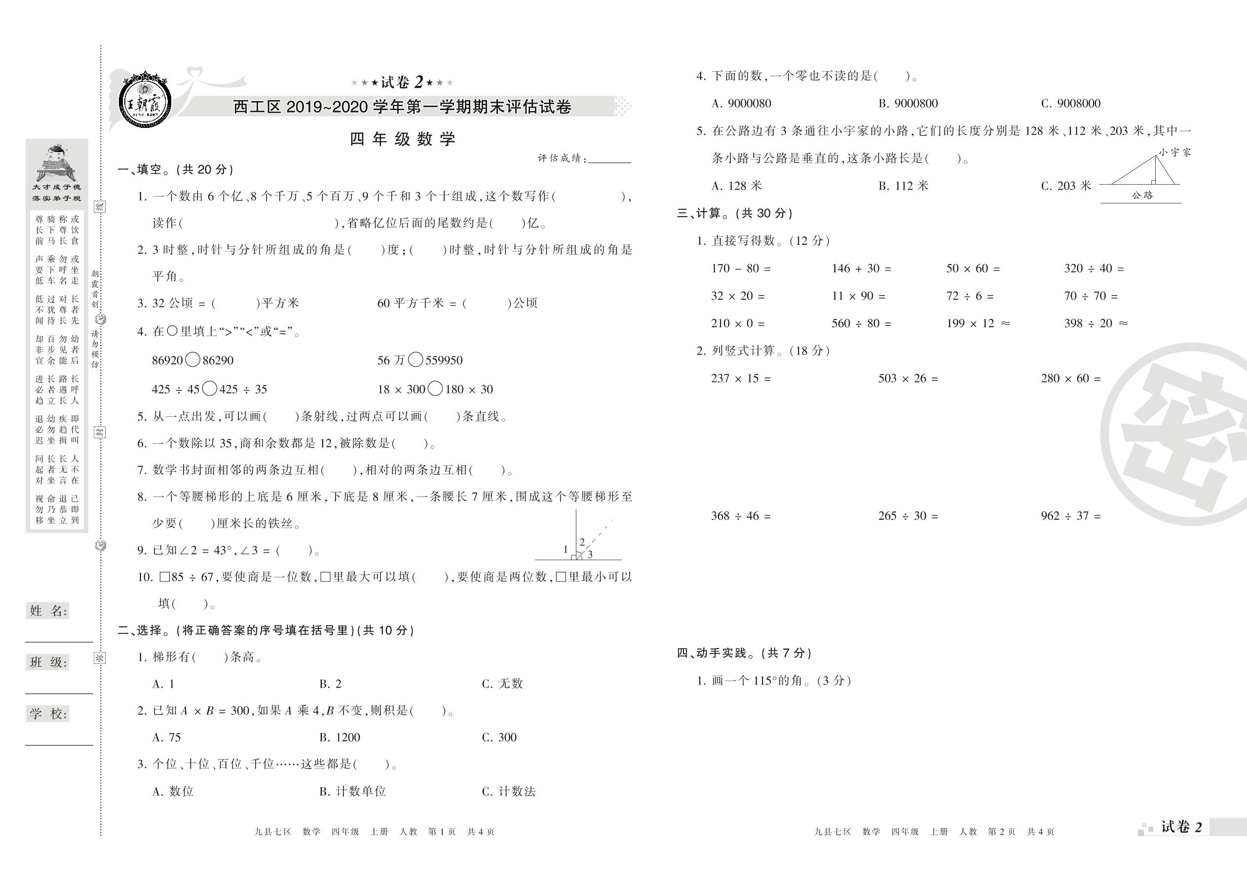 2019-2020学年第一学期洛阳市西工区四年级数学试卷(人教版)【2】