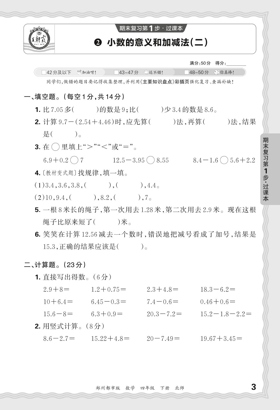 2024春下册四年级数学北师版 期末过课本郑州版·小数的意义和加减法(二)【2】