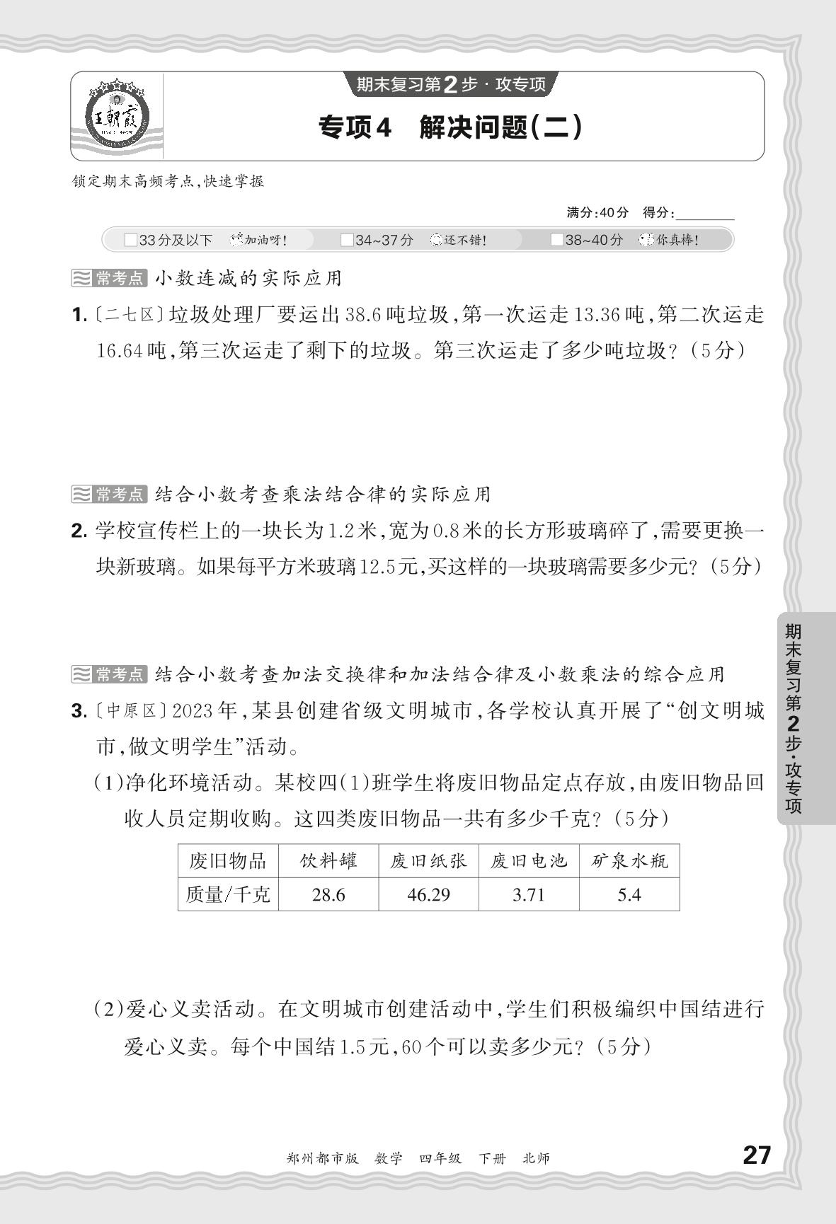 2024春下册四年级数学北师版 期末专项卷郑州版·解决问题(二)【4】
