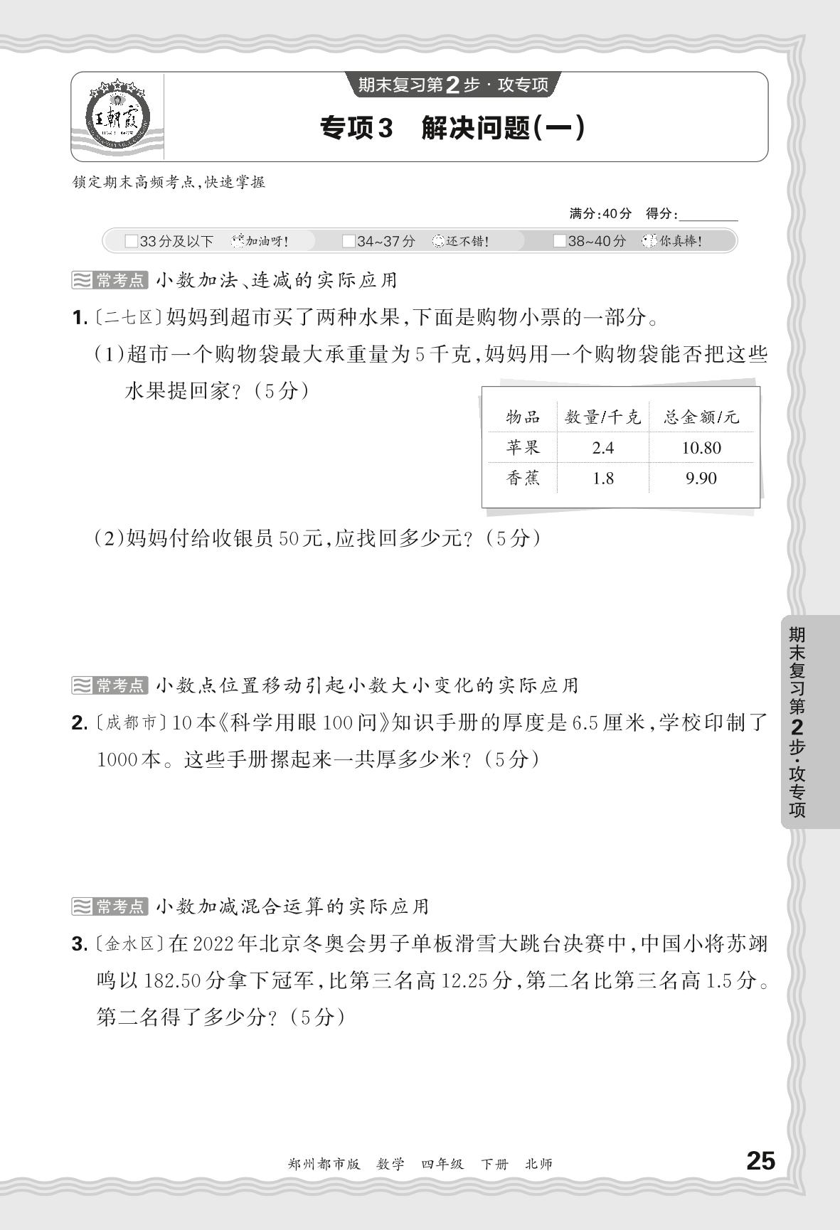 2024春下册四年级数学北师版 期末专项卷郑州版·解决问题(一)【3】