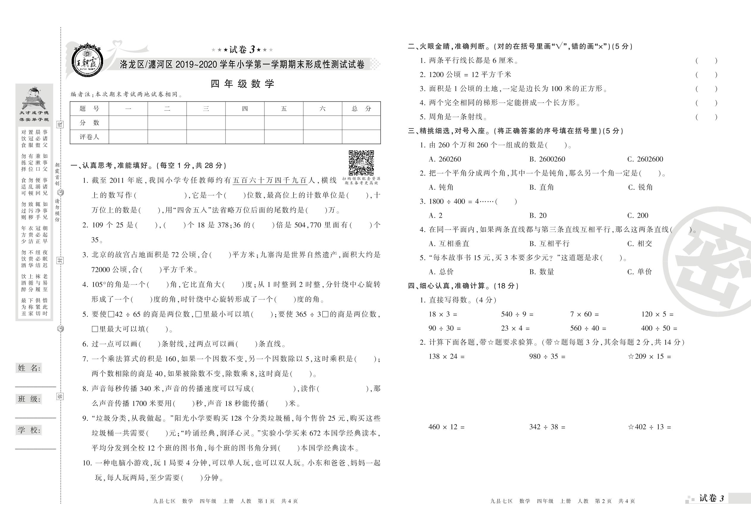 2019-2020学年第一学期洛阳市洛龙区、瀍河区四年级数学试卷(人教版)【3】