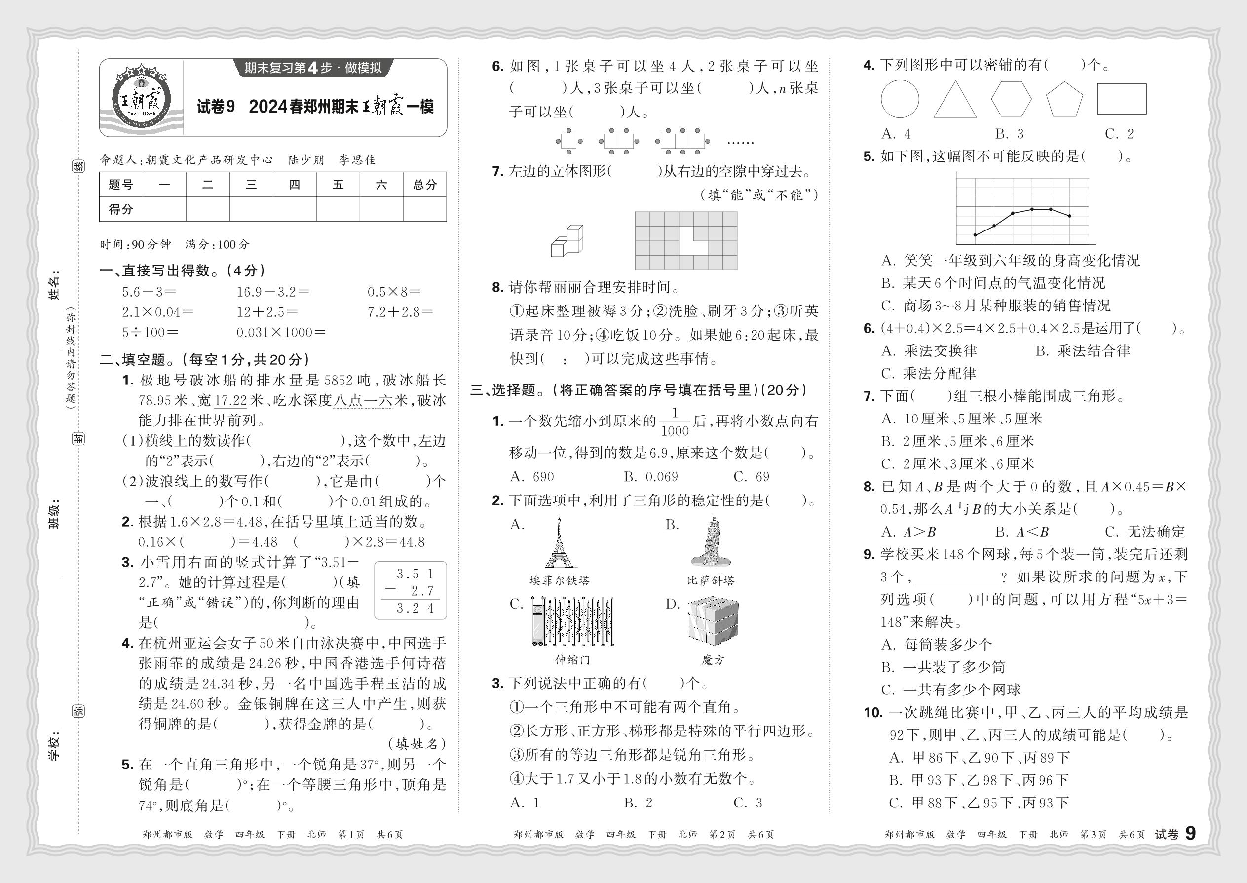 2024春下册四年级数学北师版 河南郑州期末王朝霞一模