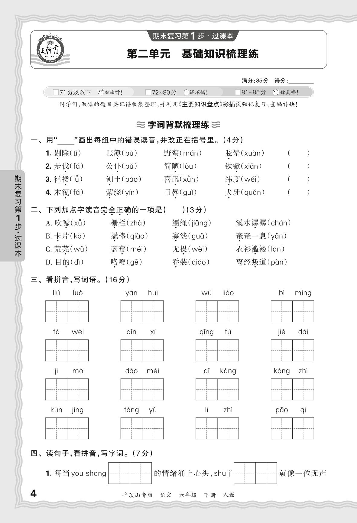 2024春下册六年级语文人教版 期末过课本平顶山版·第二单元 基础知识梳理练