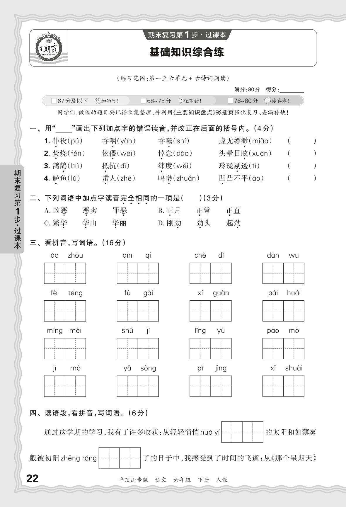 2024春下册六年级语文人教版 期末过课本平顶山版·基础知识综合练
