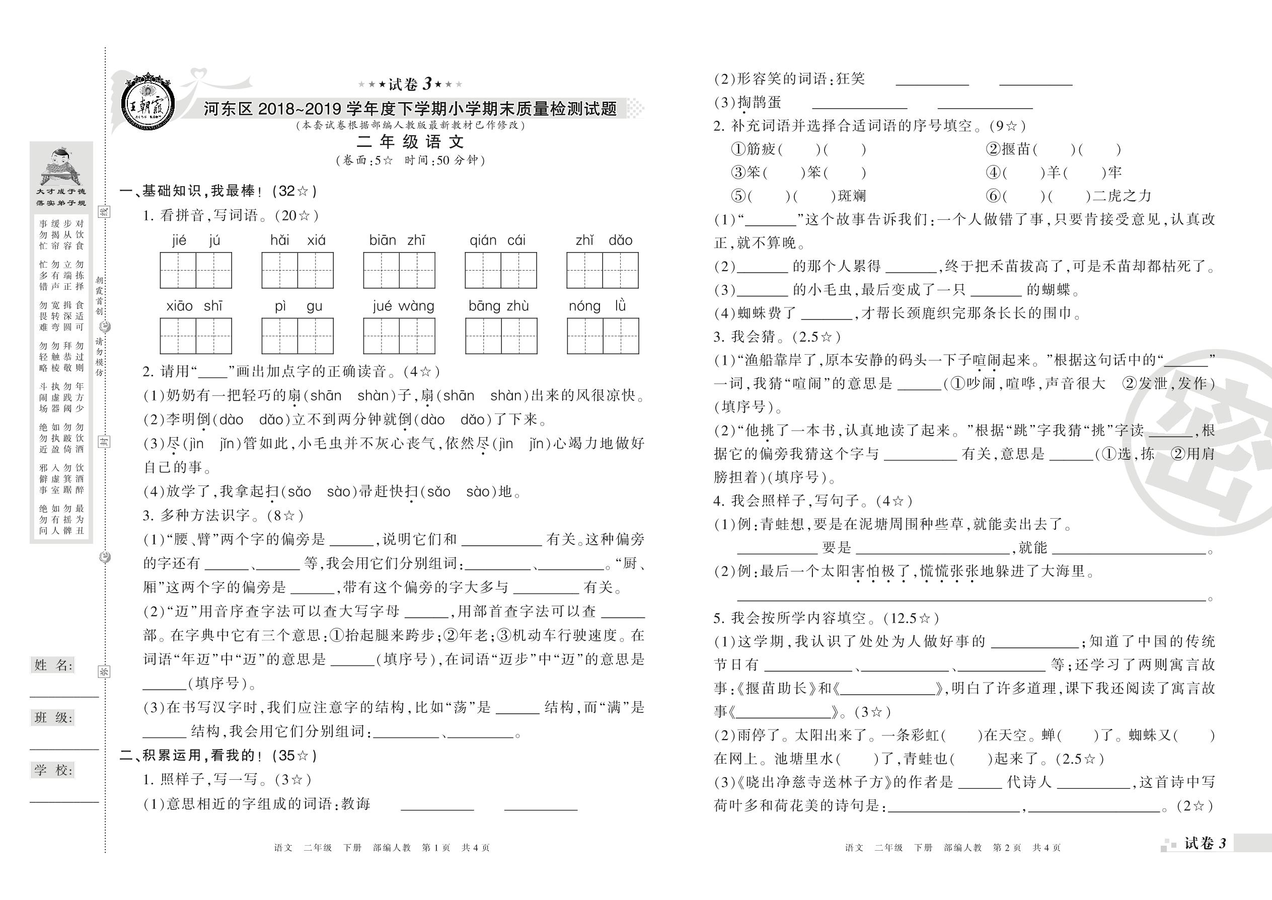 2018-2019学年第二学期临沂市河东区二年级语文试卷(人教版)【3】
