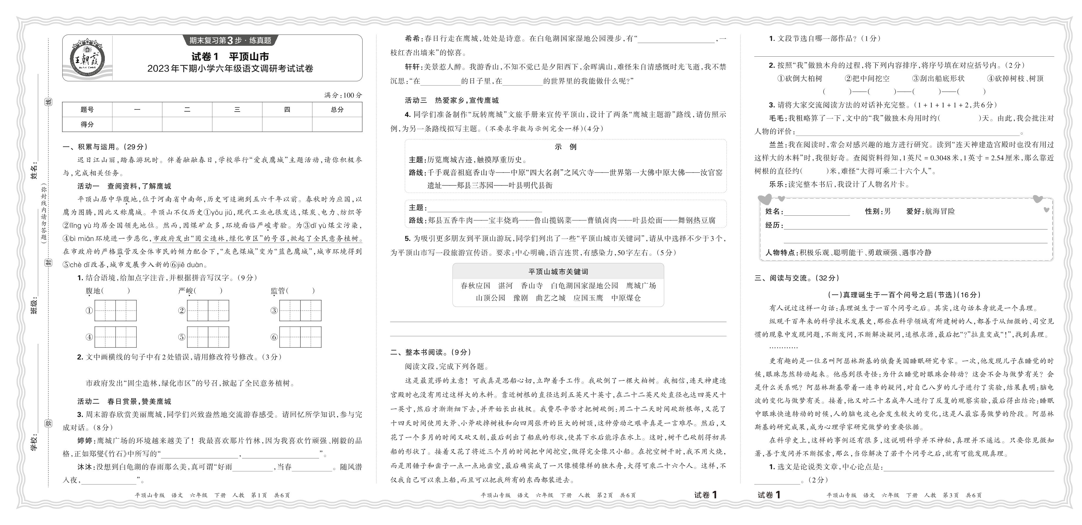 河南省平顶山市2023年下期小学六年级语文调研考试试卷(人教版)【1】