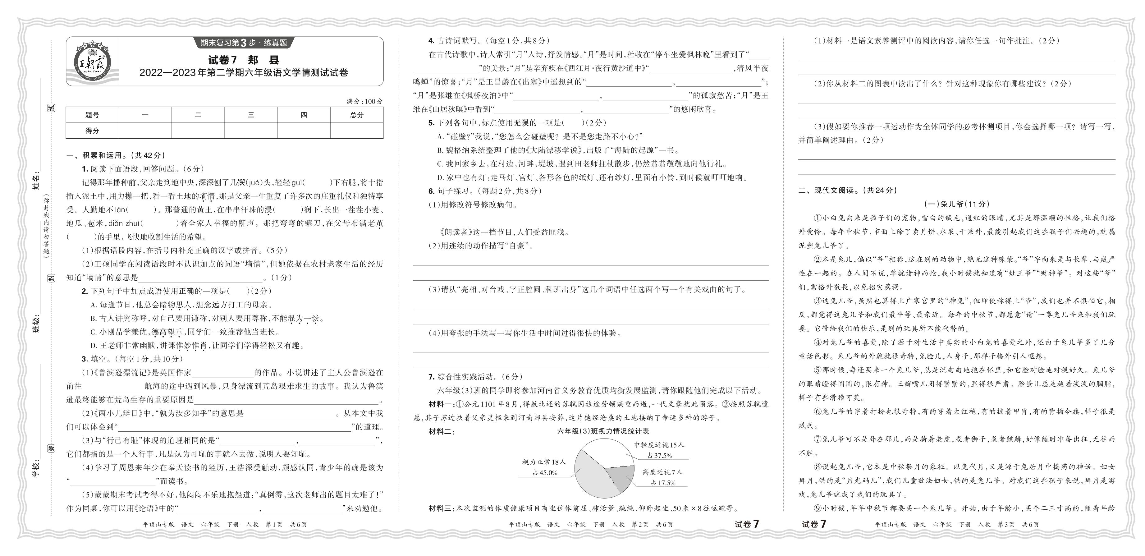 河南省平顶山市郏县2022-2023年第二学期六年级语文学情测试试(人教版)【7】