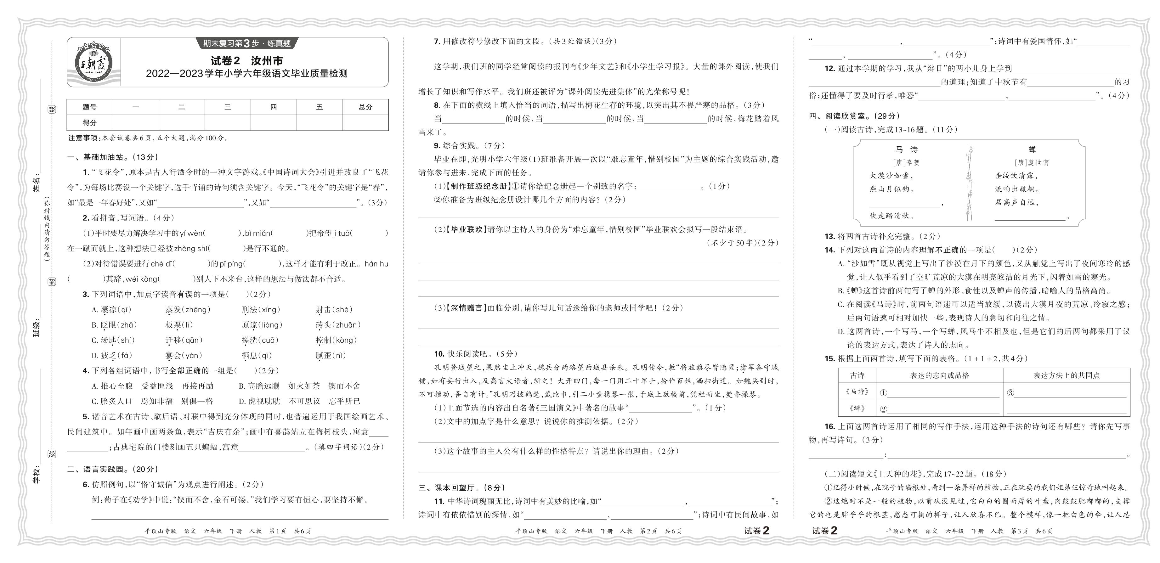 河南省平顶山市汝州市2022-2023学年小学六年级语文毕业质量检测(人教版)【2】
