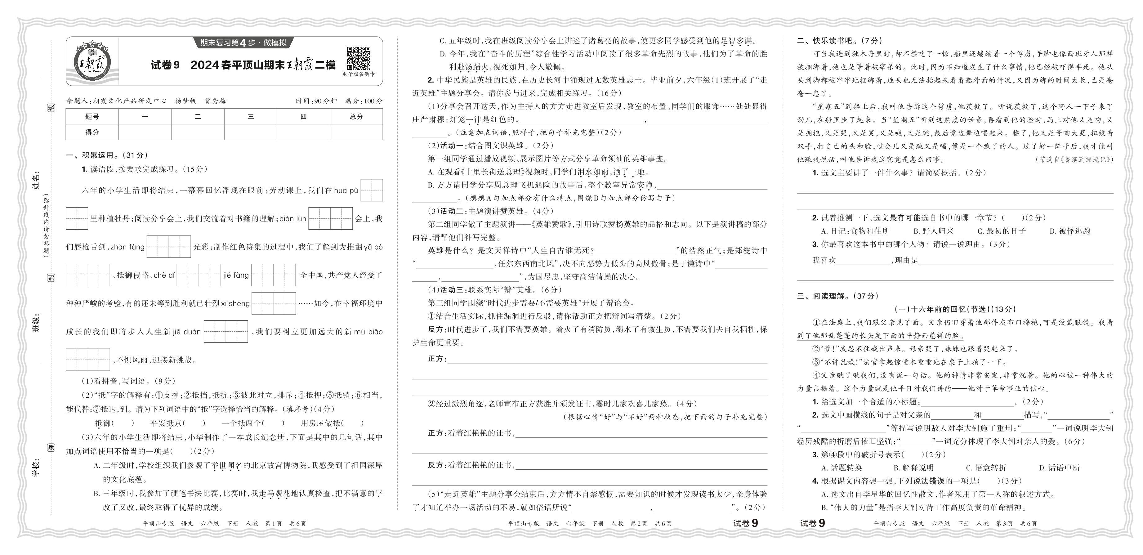 2024春下册六年级语文人教版 河南平顶山期末王朝霞二模【9】