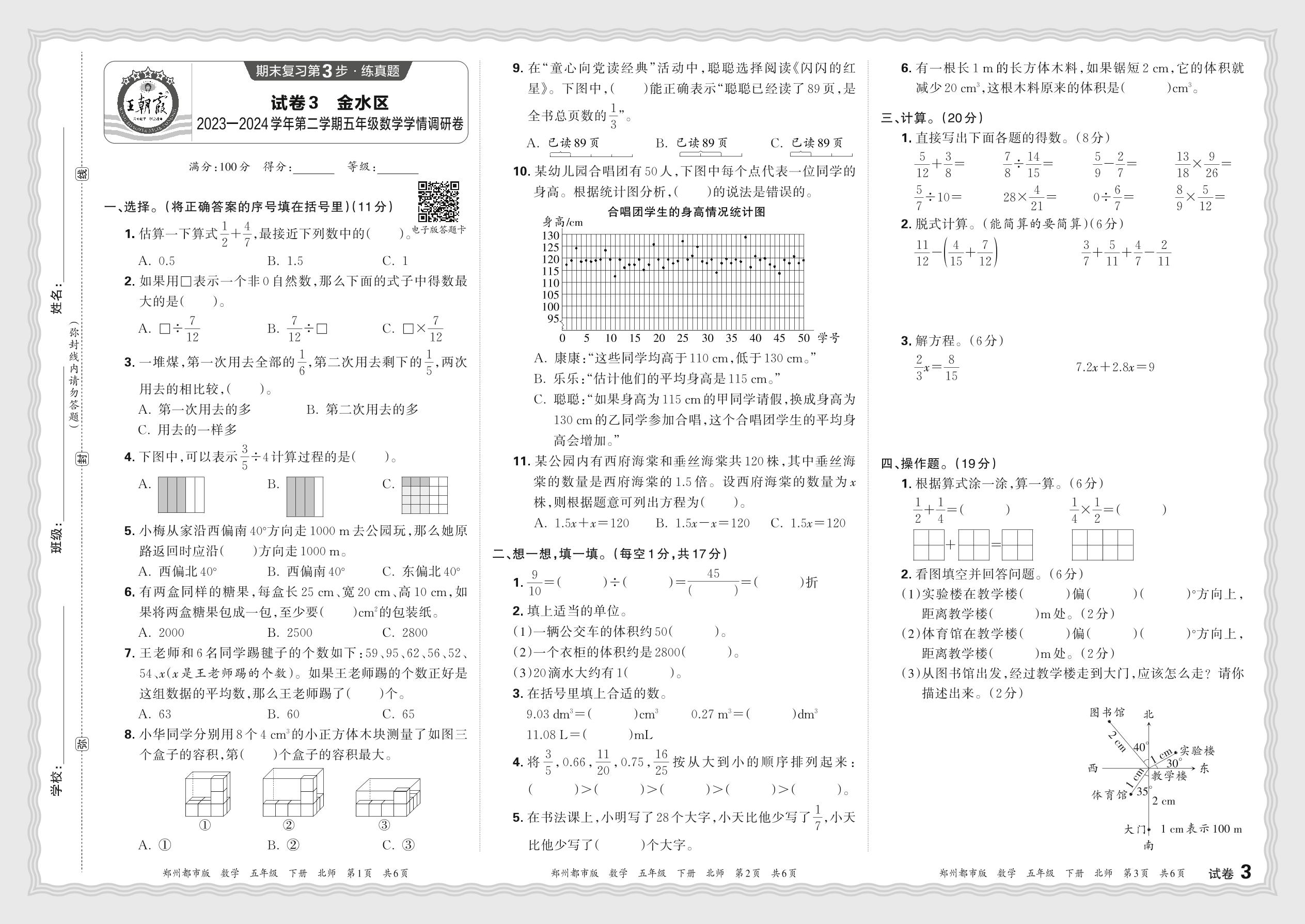 河南省郑州市金水区2023—2024学年第二学期五年级数学学情调研(北师版)【3】