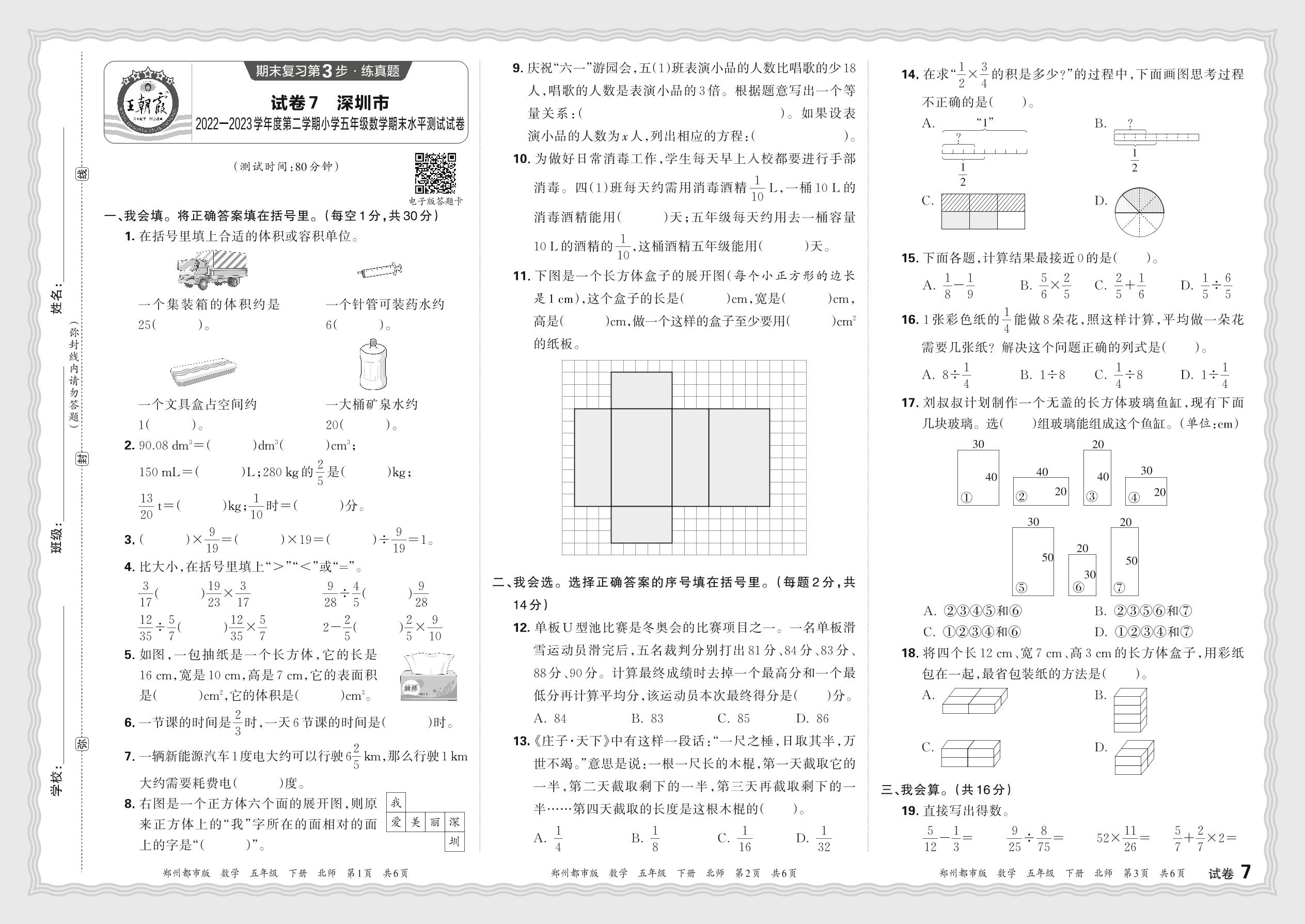 深圳市2022—2023学年第二学期小学五年级数学期末水平测试试卷(北师版)【7】