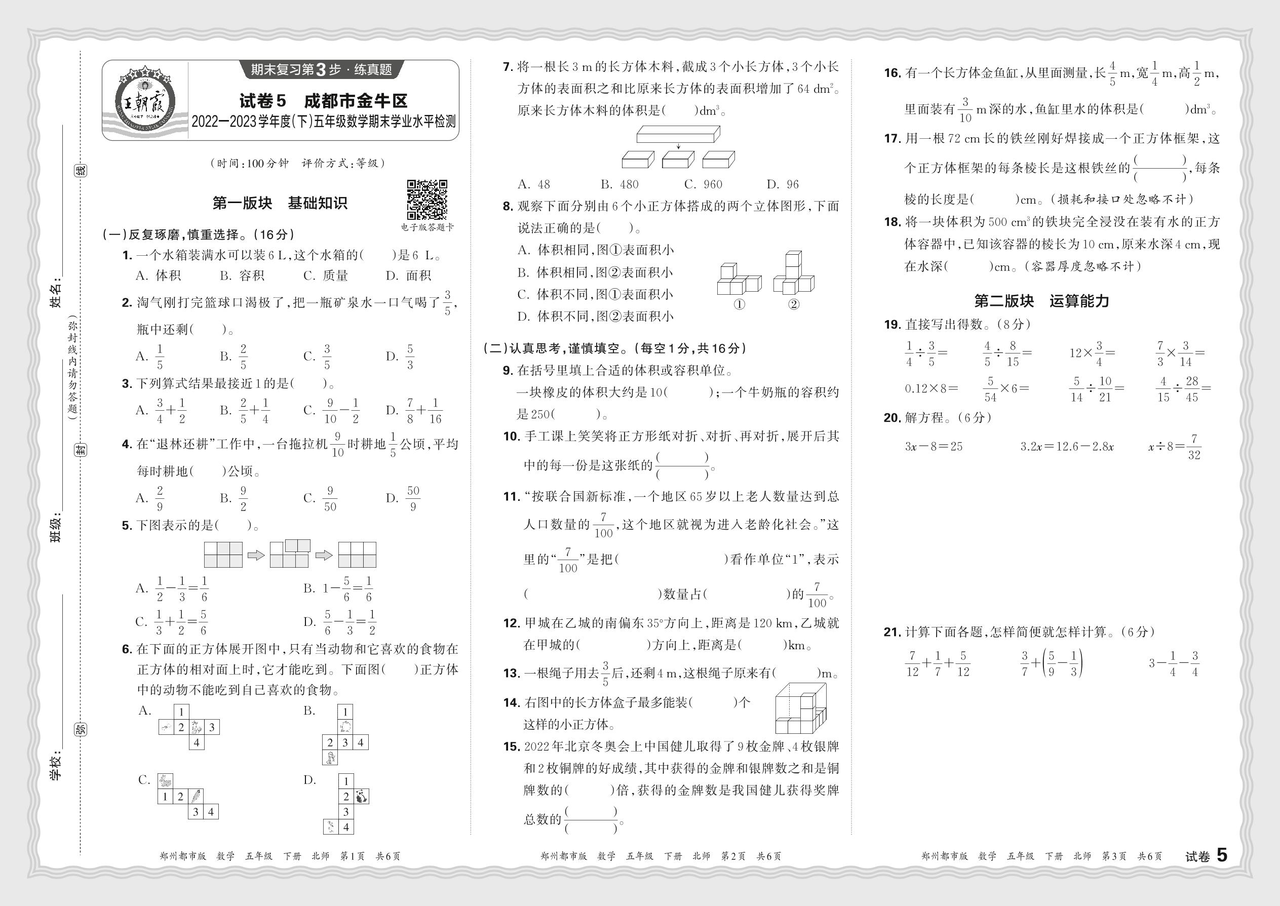 四川省成都市金牛区2022—2023学年度(下)五年级数学期末学业水平检测(北师版)【5】