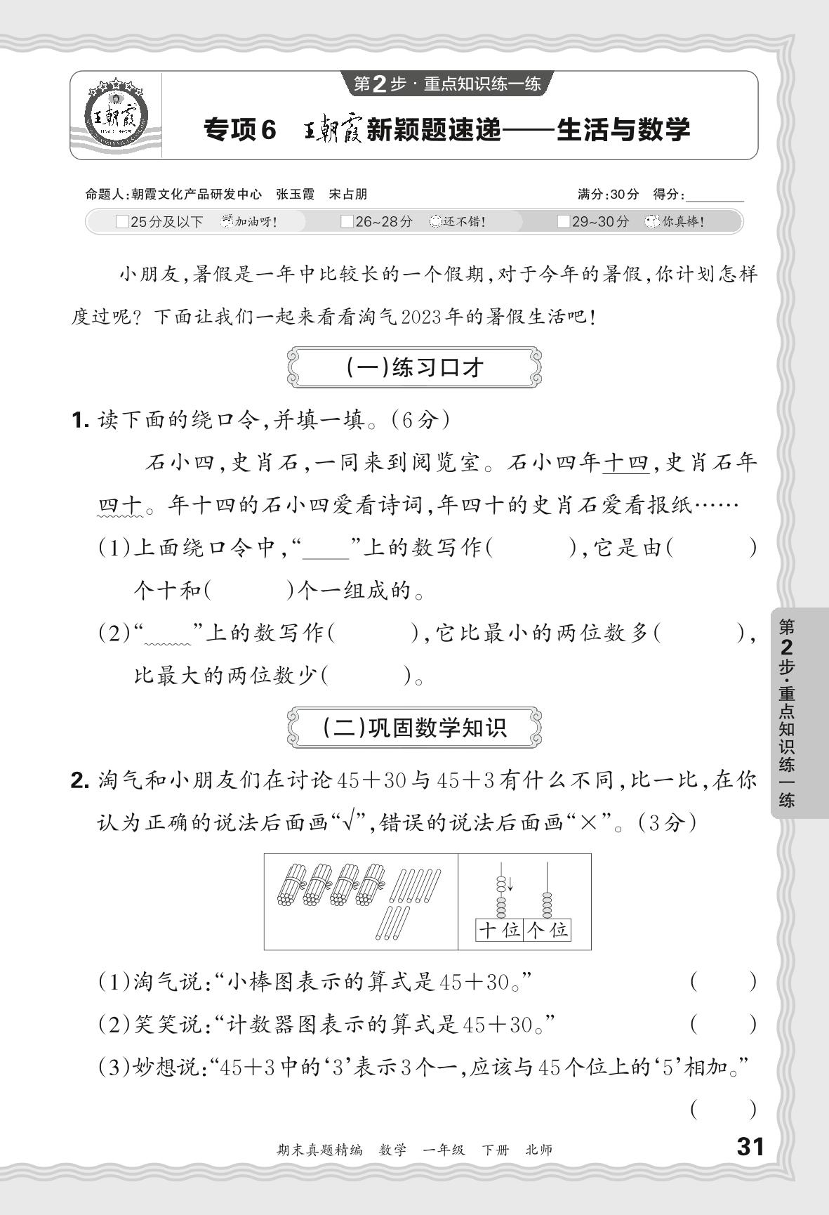 2024春下册一年级数学北师版 期末专项卷郑州版·王朝霞新颖题速递——生活与数学【6】