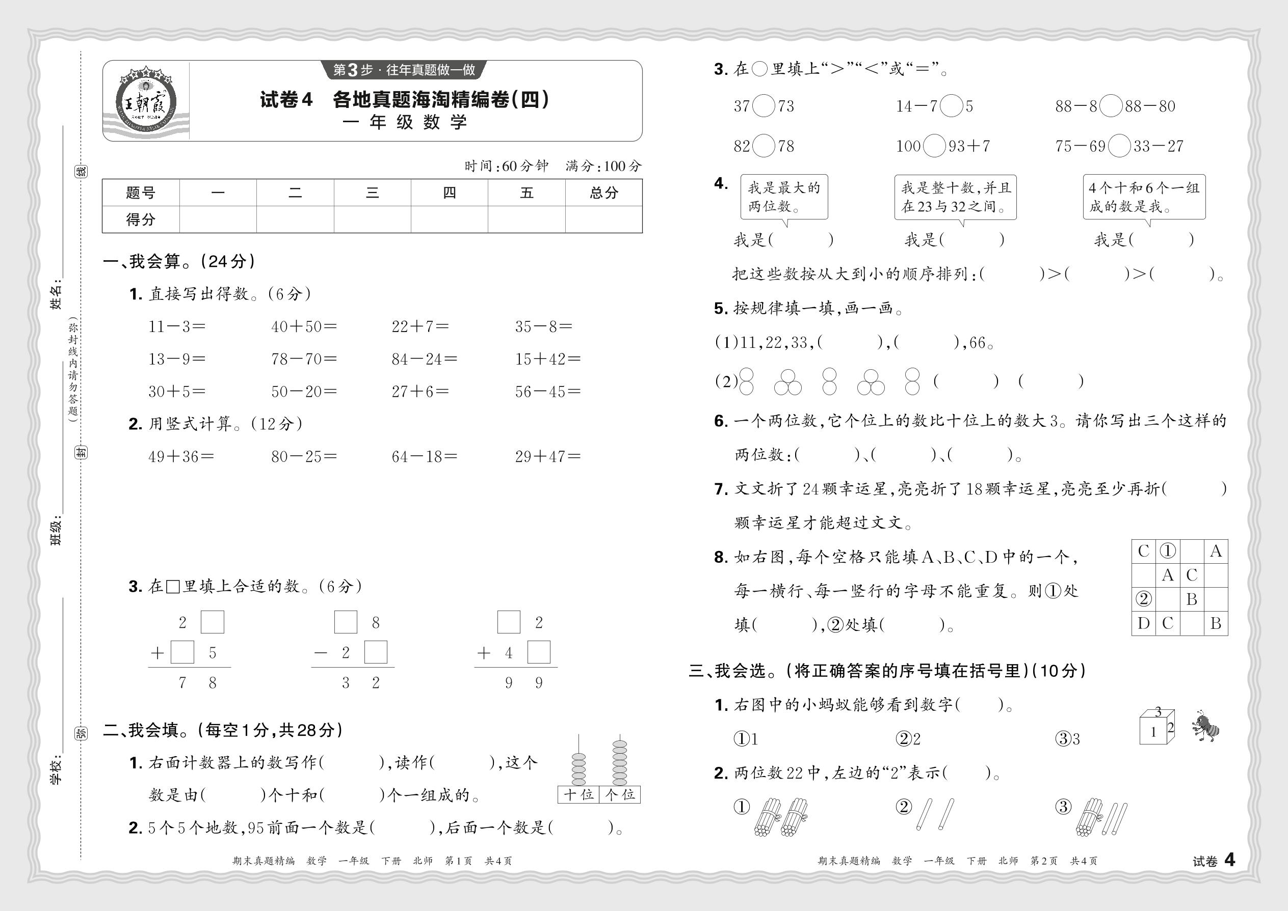 2024春下册一年级数学北师版 各地真题海淘精编卷(四)