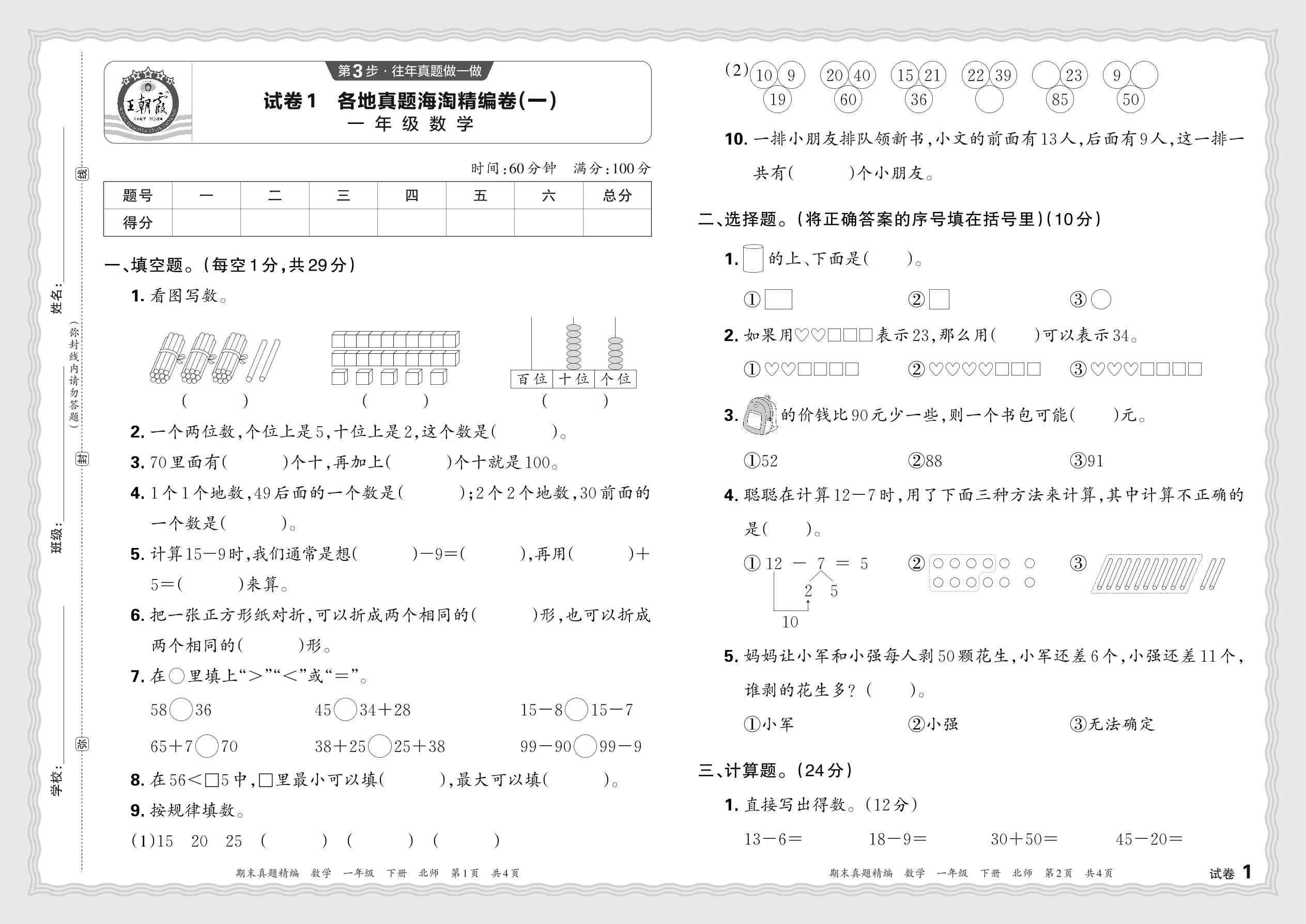 2024春下册一年级数学北师版 各地真题海淘精编卷(一)
