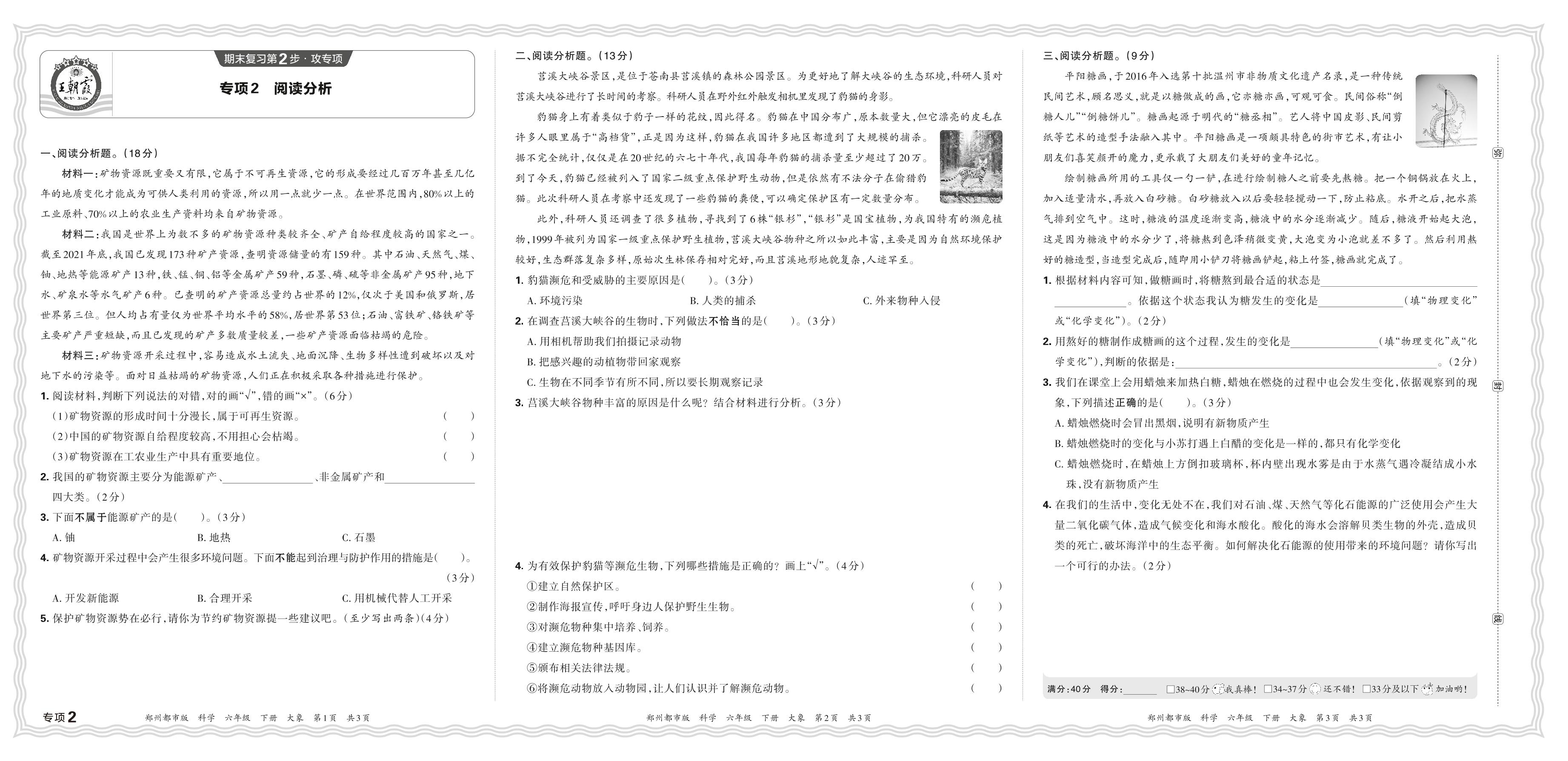 2024春下册六年级科学大象版 期末专项卷郑州版·阅读分析【2】