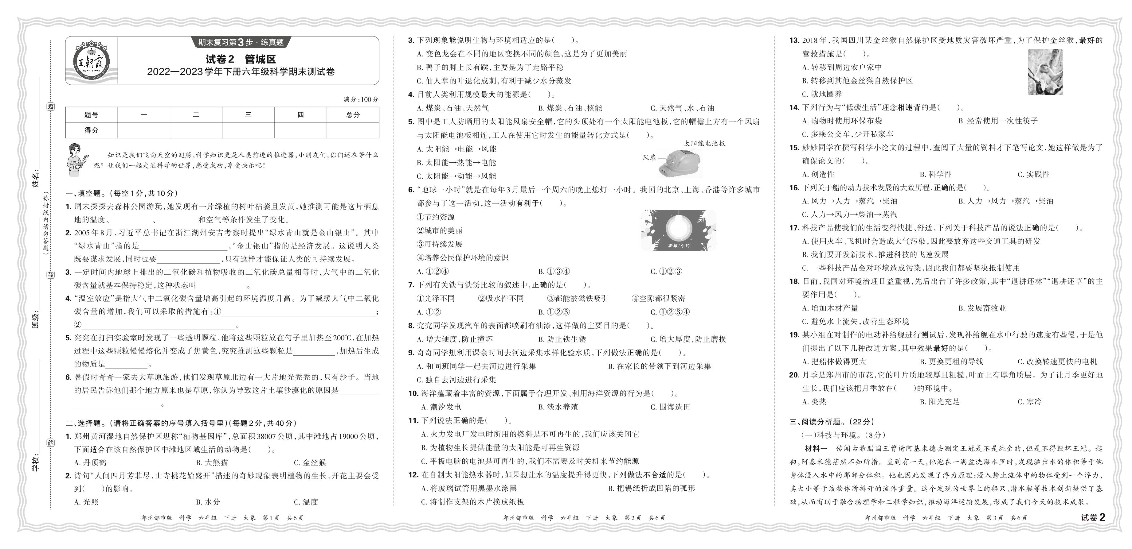河南省郑州市管城区2022—2023学年下册六年级科学期末测试卷(大象版)【2】