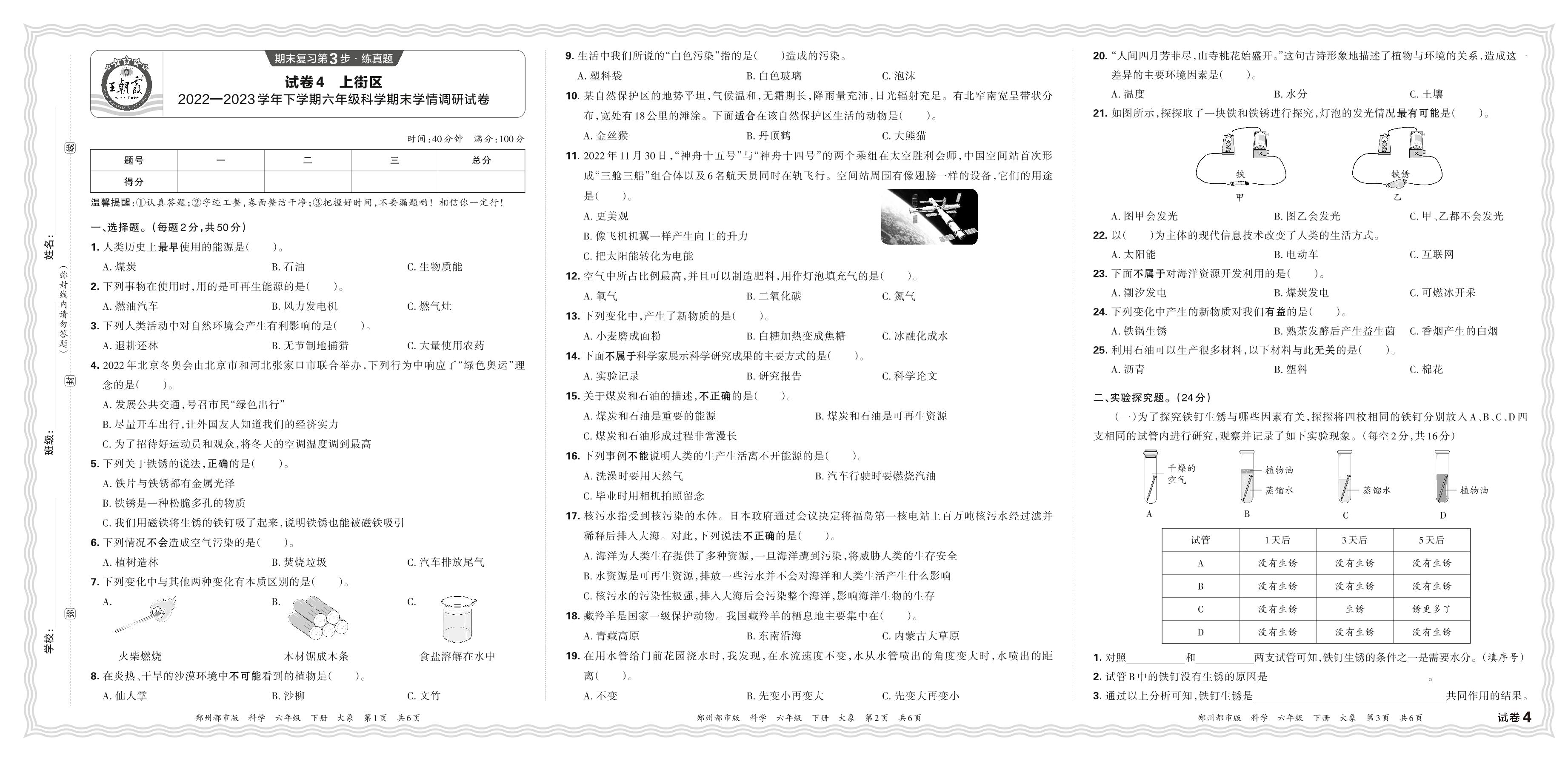 河南省郑州市上街区2022—2023学年下学期六年级科学期末学情调研试卷(大象版)【4】