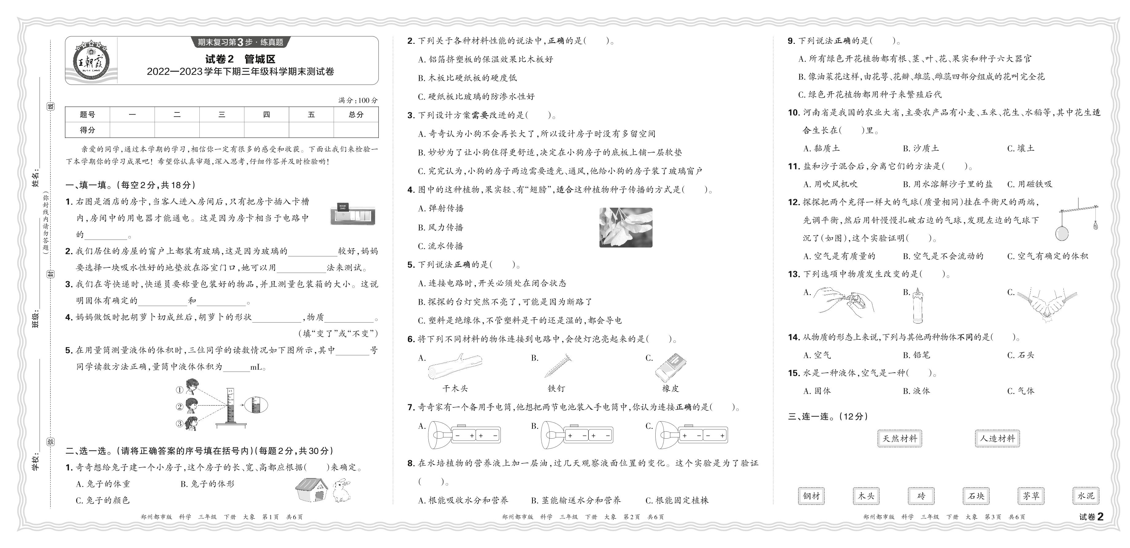 河南省郑州市管城区2022—2023学年下册三年级科学期末测试卷(大象版)【2】