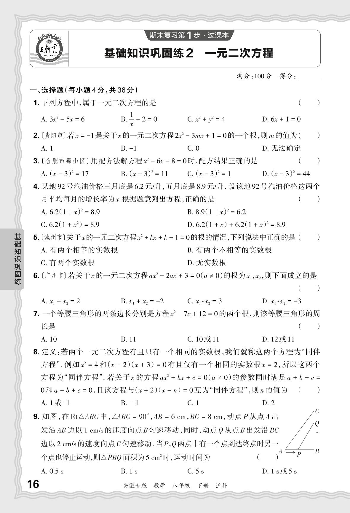2024春下册八年级数学沪科版 期末过课本安徽版·基础知识巩固练 一元二次方程【2】