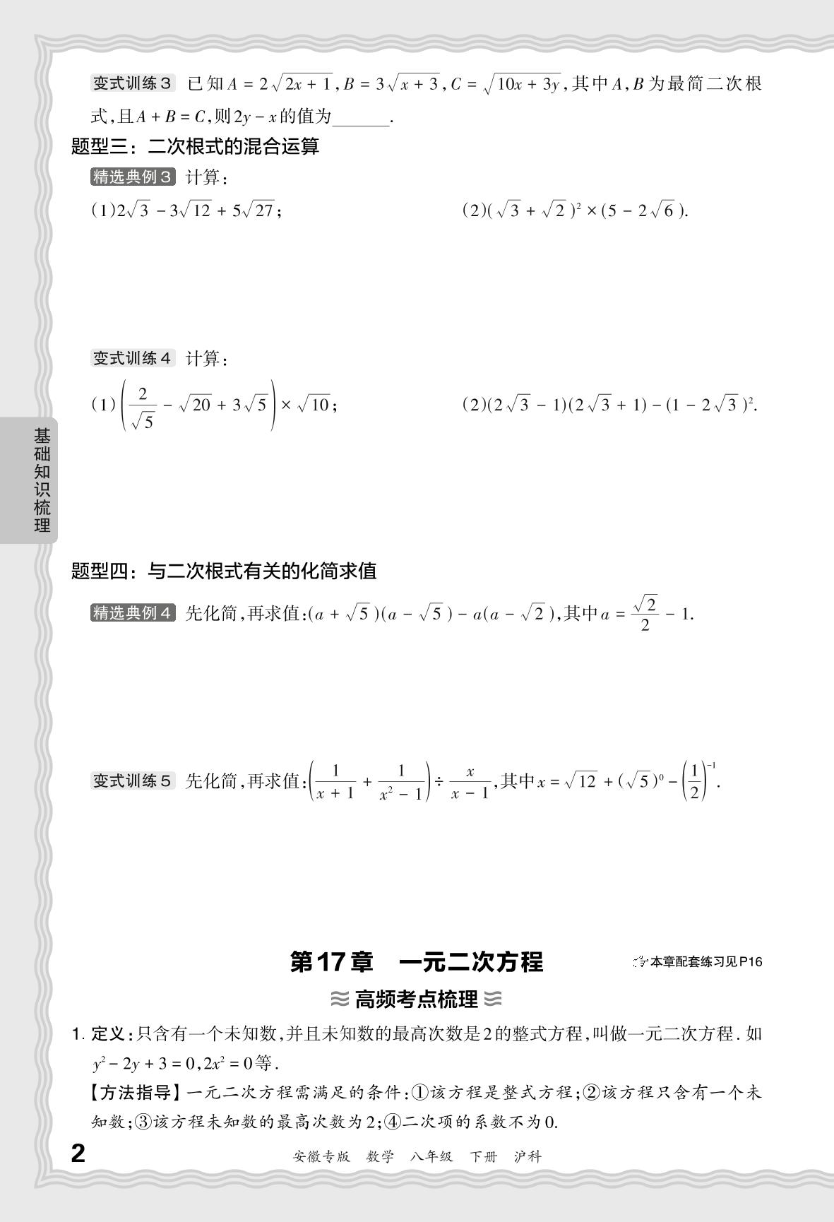 2024春下册八年级数学沪科版 期末过课本安徽版·基础知识梳理 第17章 一元二次方程