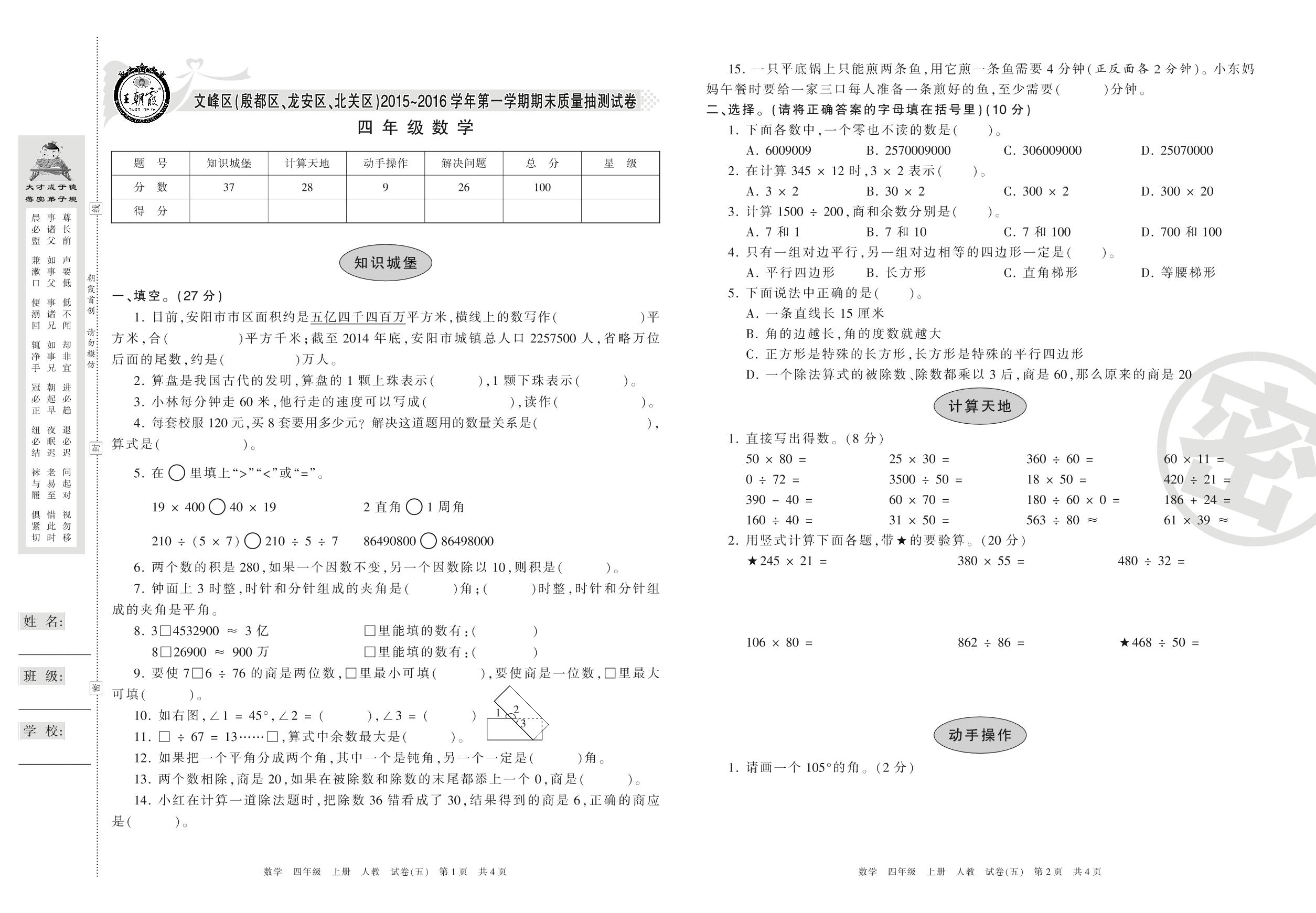 2015-2016学年第一学期安阳市文峰区(殷都区、龙安区、北关区)四年级数学试卷(人教版)【5】